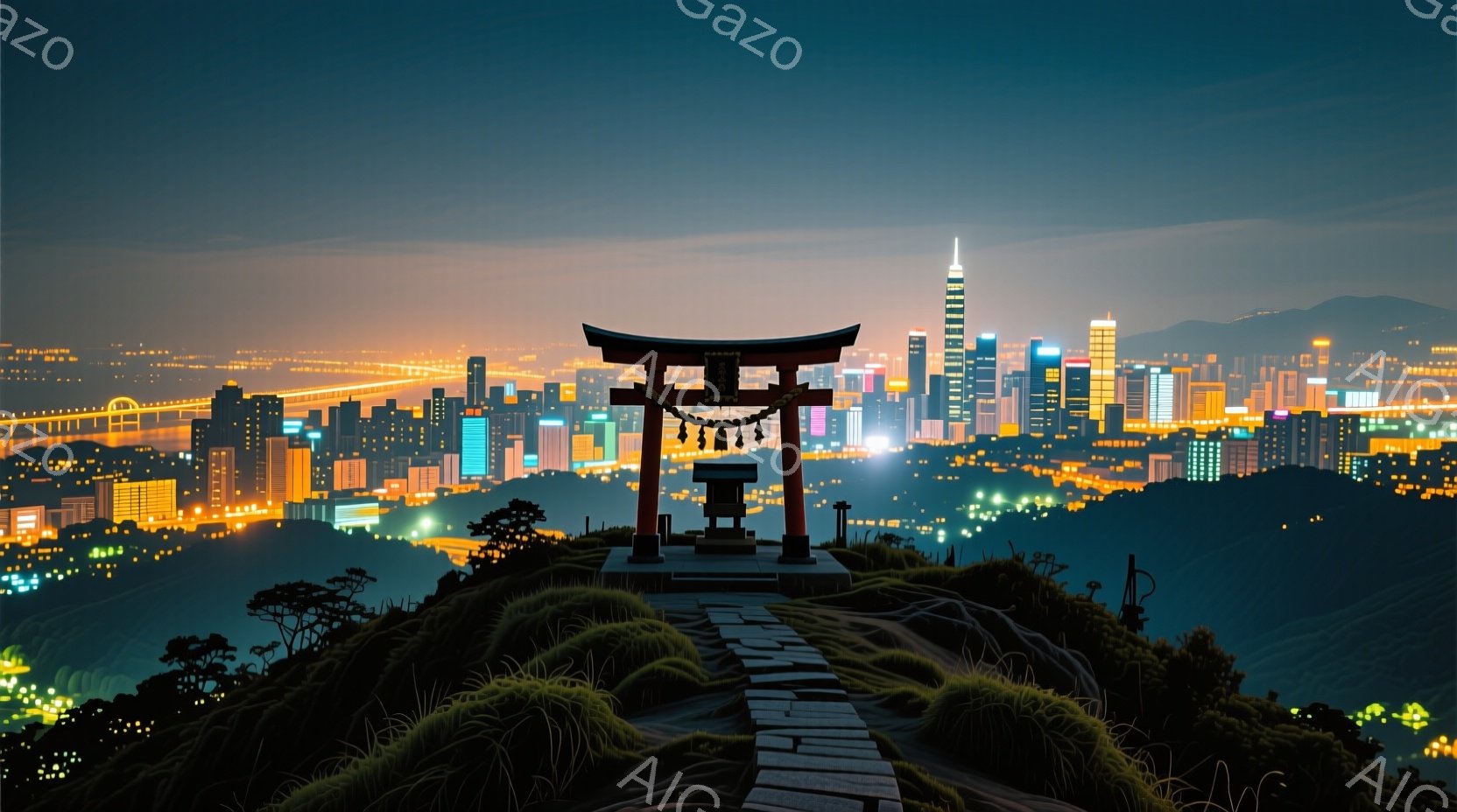 深い藍色の空を背景に、朱色の鳥居が丘の上に堂々と立っている。遠くには光り輝く都市の夜景が広がり、モダンな高層ビル群と自然の風景が対照的である。静寂で神秘的な雰囲気があり、夜空と都市の光が織りなす美しい光景が印象的だ。