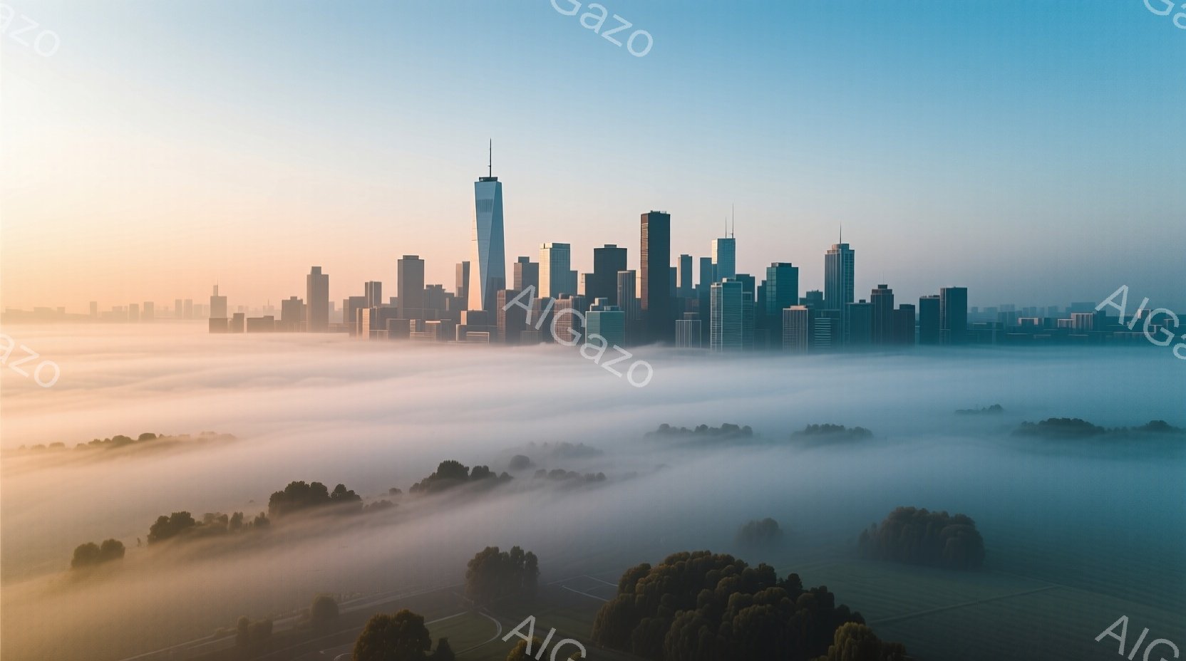 霧に包まれた都市の風景が広がり、高層ビル群が霞の中に浮かび上がっている。手前の緑豊かな草原や樹木は、霧によって幻想的な雰囲気を醸し出し、朝日の柔らかい光が全体を包み込んでいる。この景色は静寂と神秘を感じさせ、自然と都市の調和が美しい。