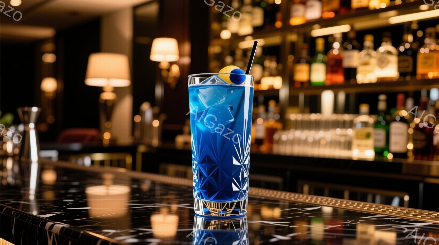 鮮やかな琥珀色の液体が、複雑なカットが施されたクリスタルグラスに満たされている。グラスの表面は光を反射し、周囲に美しい輝きを放っている。背景は暗く、グラスと影が際立ち、落ち着いた雰囲気を作り出している。
