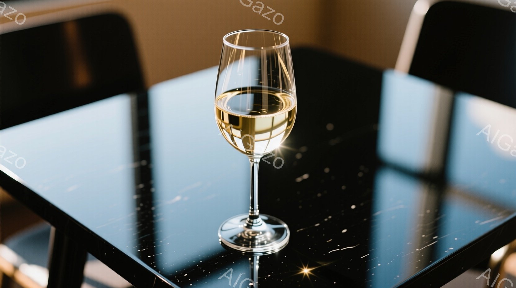 画像には、洗練された脚付きグラスが写っており、中に淡い色の液体が入っています。グラスは複雑なカットが施され、光を反射して輝きを増しています。背景はグレーがかった単色で、グラスが際立つように設計されています。