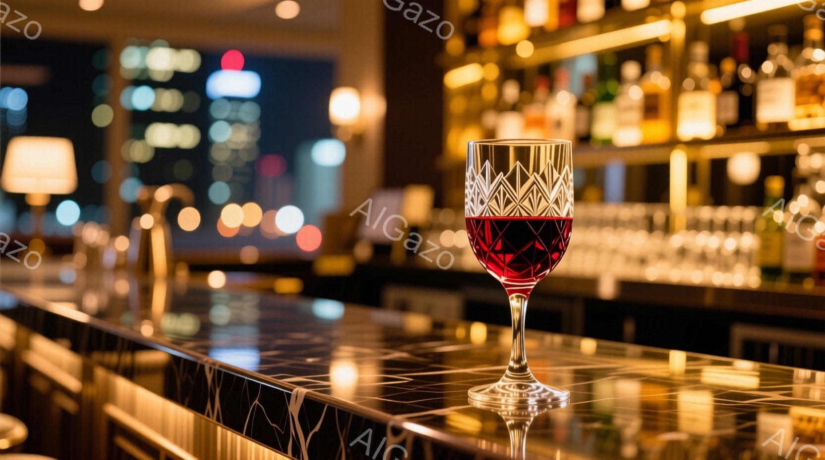 大理石のカウンターの上にワインボトルとワイングラスが置かれている。背景には、さまざまな種類のボトルが並んだバーカウンターと、暗めの照明、そして少しぼやけたソファが見える。全体的に落ち着いた雰囲気で、洗練されたバーのインテリアが印象的である。