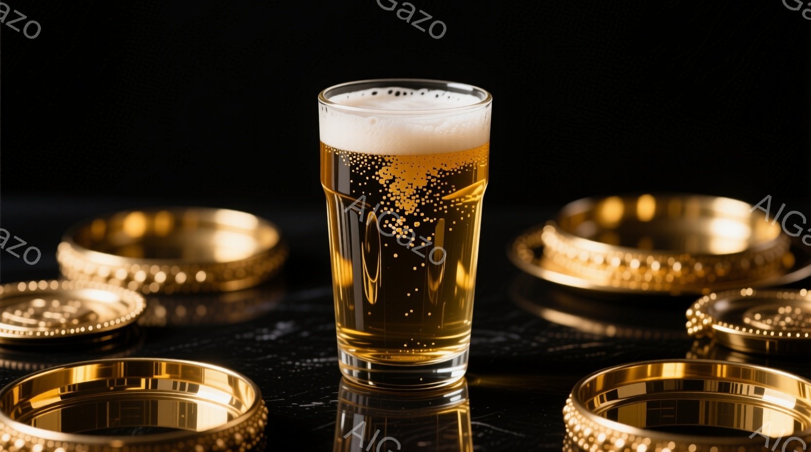 画像には、磨かれた黒い大理石のカウンターの上に置かれたグラスに入った泡立つ金色のビールが写っています。背景はぼやけており、バーカウンターといくつかのボトルが見え、暖かい黄色の光が反射しています。 全体的に、洗練されたモダンな雰囲気で、ビールが心地よくリラックスできる瞬間を捉えています。