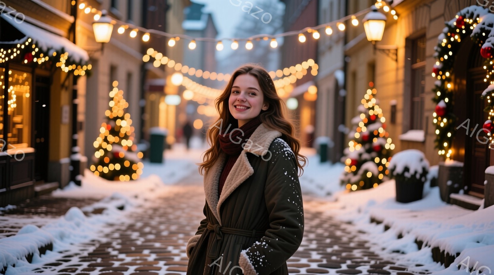 長い黒いコートを着た女性が雪の降る街並みに立っている。彼女は黒いブーツを履き、肩にかけて茶色のハンドバッグを下げている。背景にはクリスマスギフトの大きな積み重ねがあり、店舗のショーウィンドウが並び、全体的に冬の華やかさと優雅さを感じさせる雰囲気である。