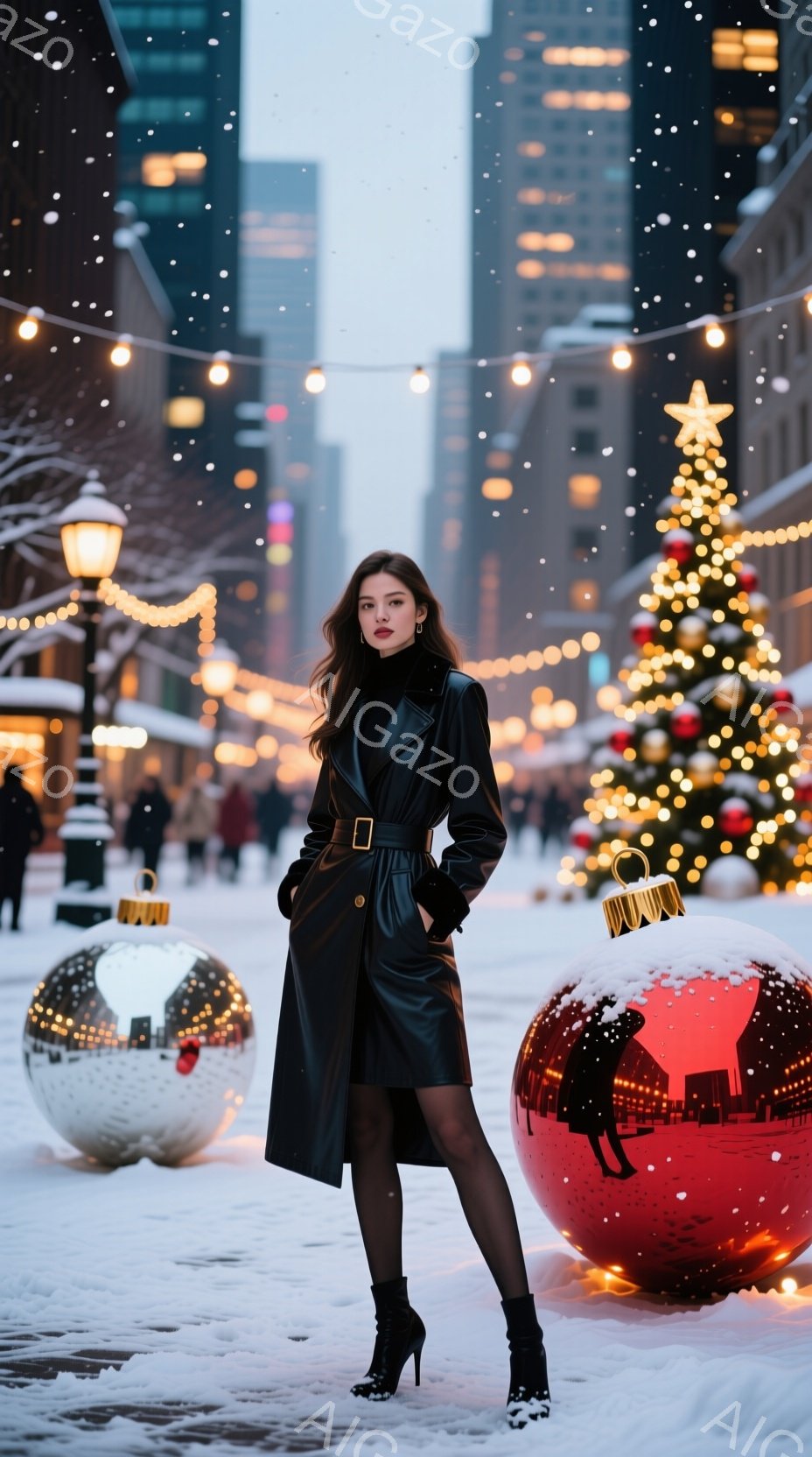 黒いコートを着た女性が、雪景色を背景に立っている。彼女は髪を軽くカールさせ、落ち着いた表情でカメラを見つめている。背景には、雪に覆われた高層ビル群と、クリスマスツリーの輝くイルミネーションが広がり、冬の夜の暖かく幻想的な雰囲気を醸し出している。