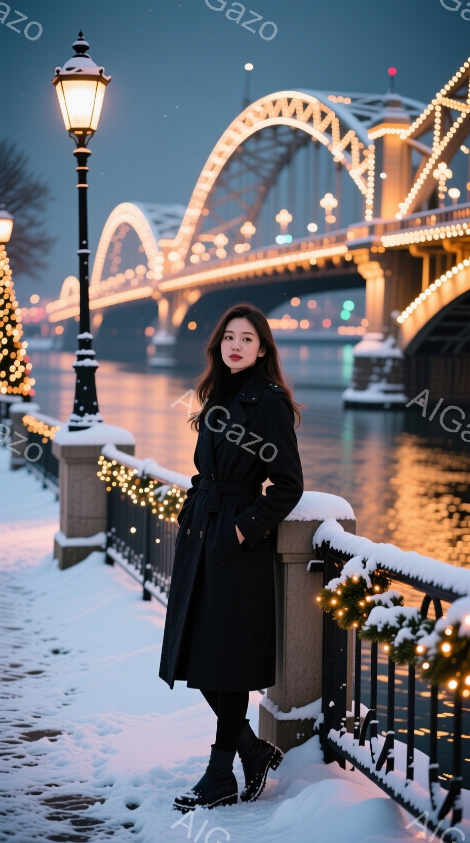 黒いコートとミニドレスを着た女性が、雪の降る石畳の通りを正面から見つめながら歩いている。彼女は長い茶色の髪を持ち、控えめな表情で、ブーツを履いて冬の装いを完成させている。背景には、クリスマス装飾が施された建物が並び、雪が降り積もる冬の街並みが広がっている。