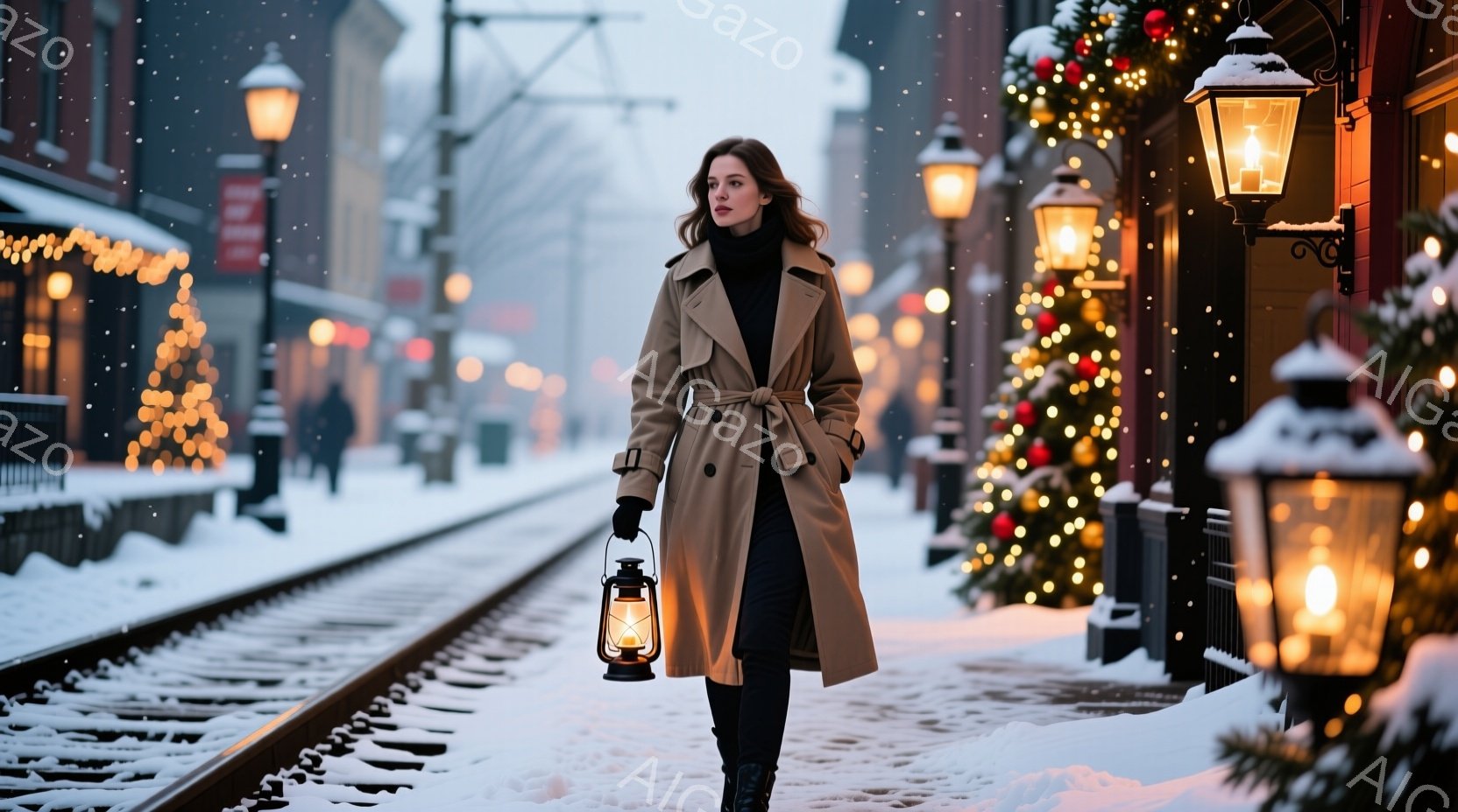 長い黒髪をなびかせた女性が、黒いコートを着て階段に立っています。彼女は少し微笑んでおり、冬の装飾で飾られた階段が背景にあります。雪が舞い散る冬の雰囲気で、上品で洗練された印象を与えます。