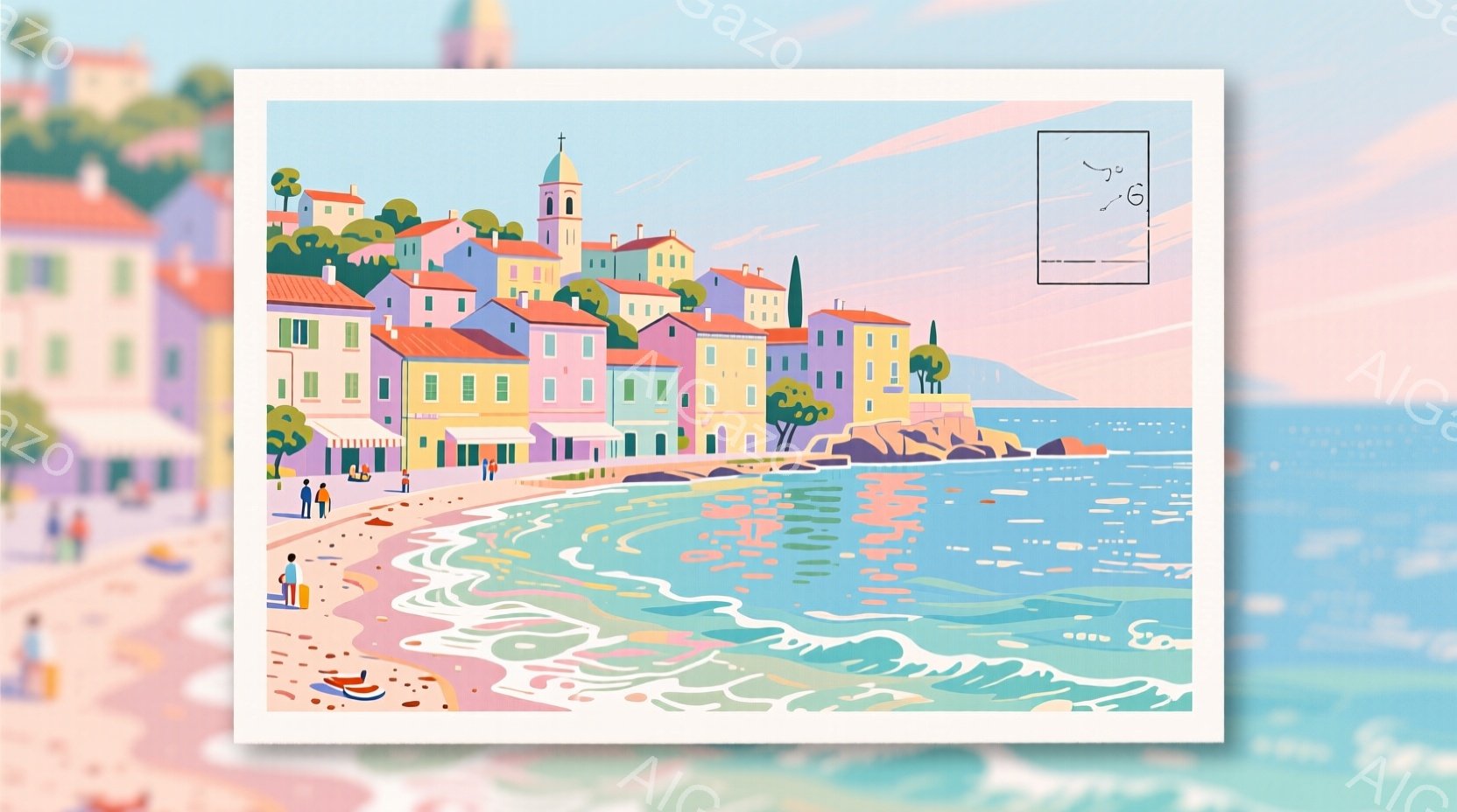 カラフルな建物が並ぶ、地中海沿岸の美しい風景が描かれています。穏やかな水面にはヨットが浮かび、岩場や砂浜が連なっています。全体的に暖かく、のどかで、リラックスした雰囲気が漂っています。