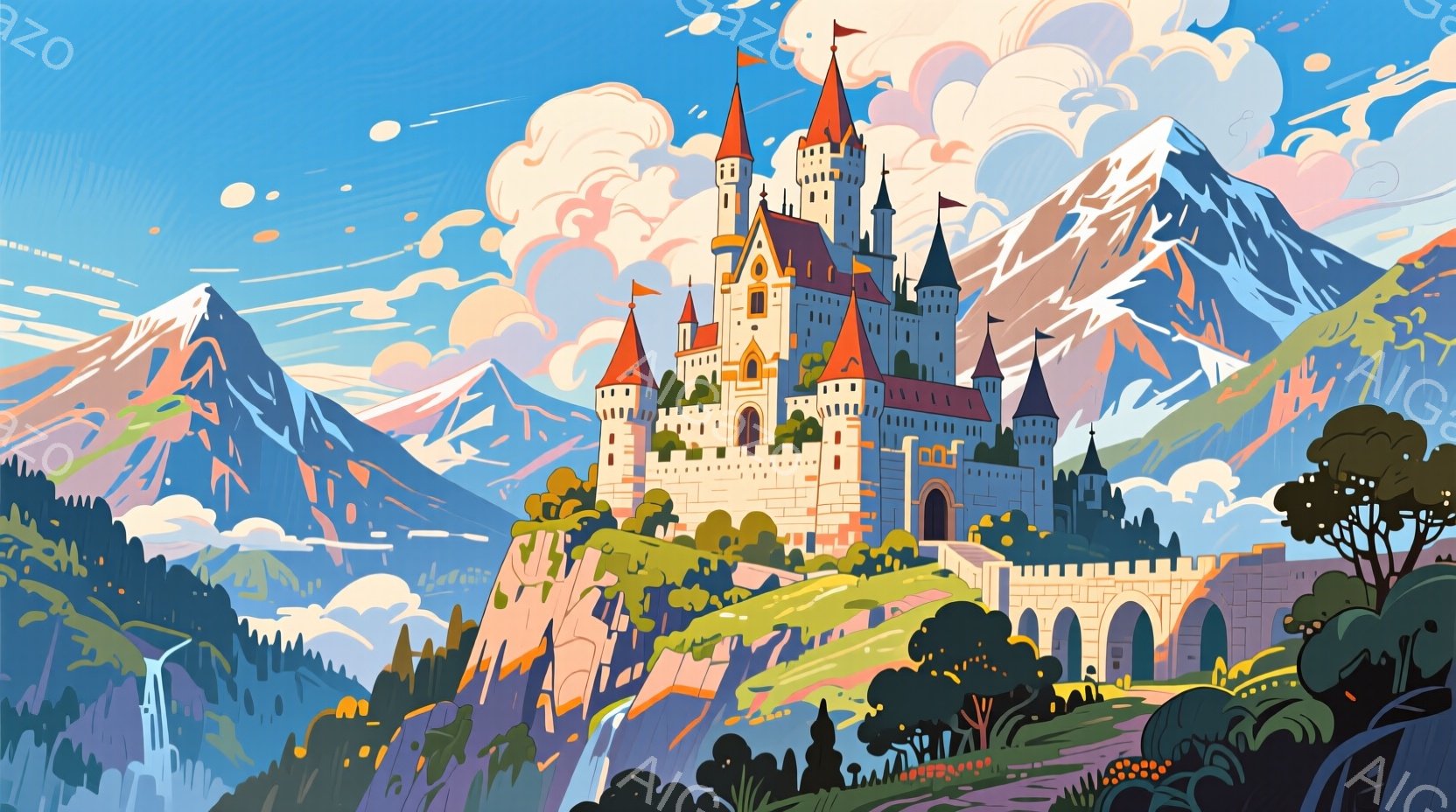 険しい山の上に堂々とそびえ立つお城が印象的です。ピンクと白を基調としたお城は、複数の塔と城壁を持ち、鮮やかな旗が風になびいています。周囲には緑豊かな丘陵地帯が広がり、背景には雪を抱いた山々が連なり、晴天の空には雲が浮かび、おとぎ話のような幻想的な雰囲気を醸し出しています。