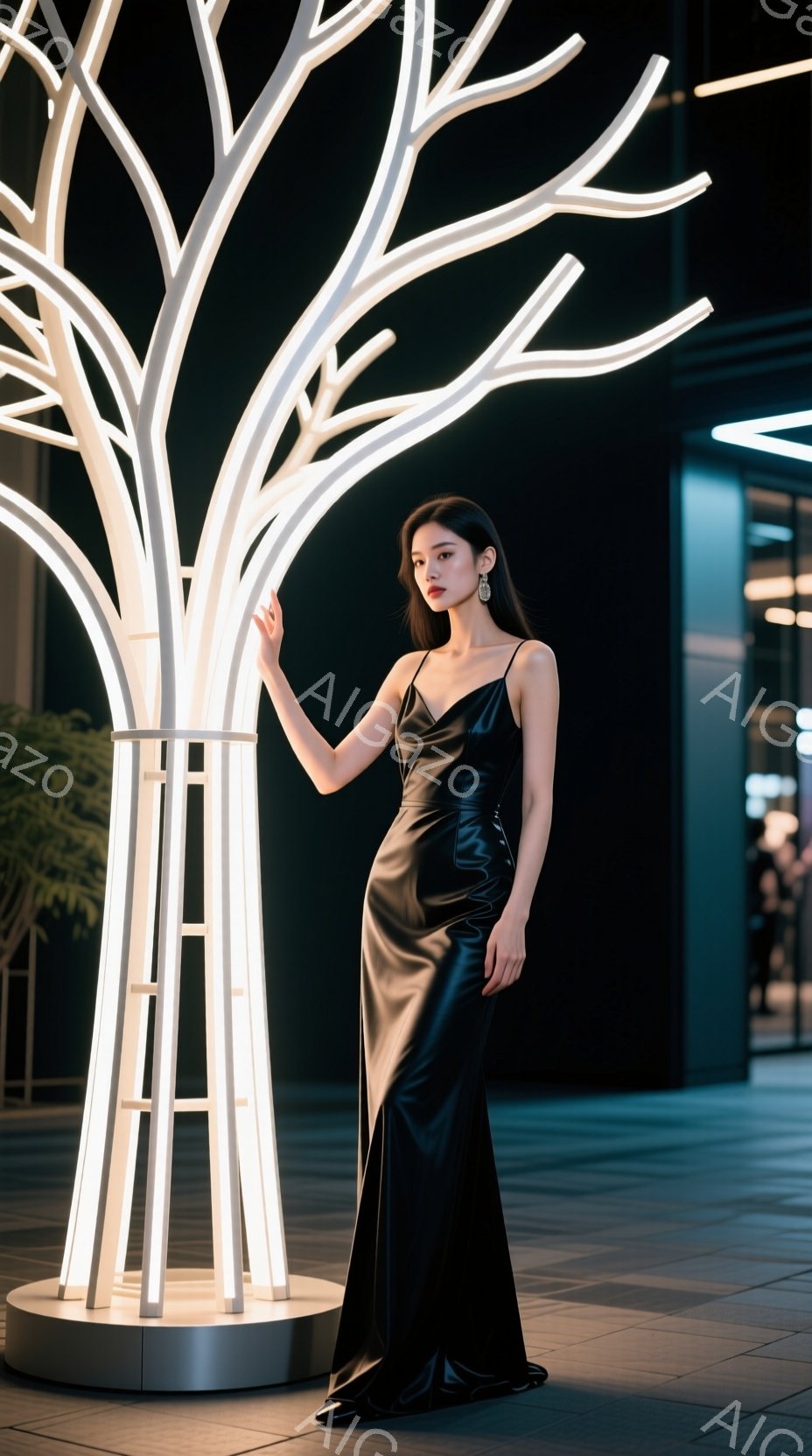 長い茶色のコートを着た女性が、イルミネーションで飾られた並木道を歩いている。彼女は黒髪で、少しうつむき加減で歩いており、冬の夜の静けさの中に佇んでいるように見える。背景には雪が積もった道路と、遠くのビル群がぼんやりと見え、幻想的で落ち着いた雰囲気を醸し出している。