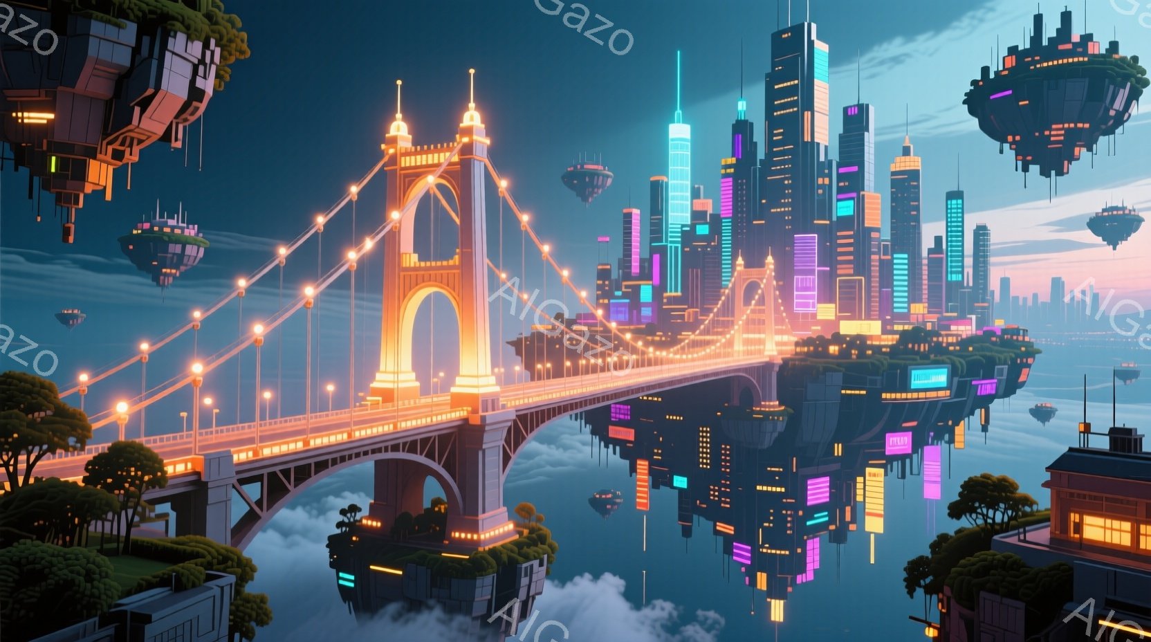 鮮やかなネオンカラーで照らされた未来都市が雲海の上に浮かぶ幻想的な風景です。高い建物が密集し、独特の形状の浮遊島が点在しており、壮大な橋がそれらを繋げています。全体的に、サイバーパンクとファンタジーが融合した、夢のような雰囲気です。