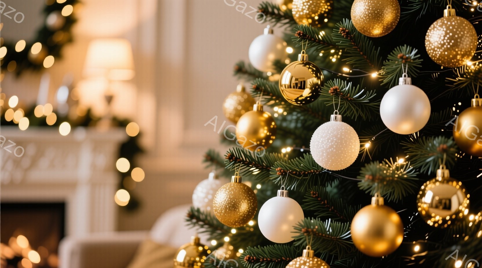 クリスマスツリーが写っており、金と白のオーナメントが輝いています。背景にはぼやけた暖色系の光と家具が見え、お祝いの雰囲気を醸し出しています。全体的に温かく、華やかな印象を与えるクリスマスシーズンの写真です。