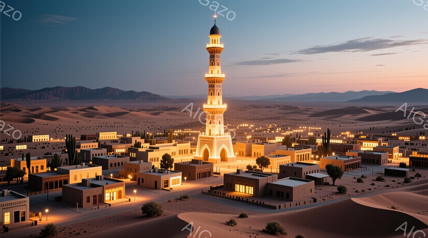 広大な砂漠の中に、土壁の建物が密集した古代都市が広がっている。夕暮れ時の空の下、建物全体がオレンジ色の光に照らされ、特に高い塔が都市の中心で際立っている。ヤシの木が点在し、遠くには山々が見え、静かで神秘的な雰囲気を醸し出している。