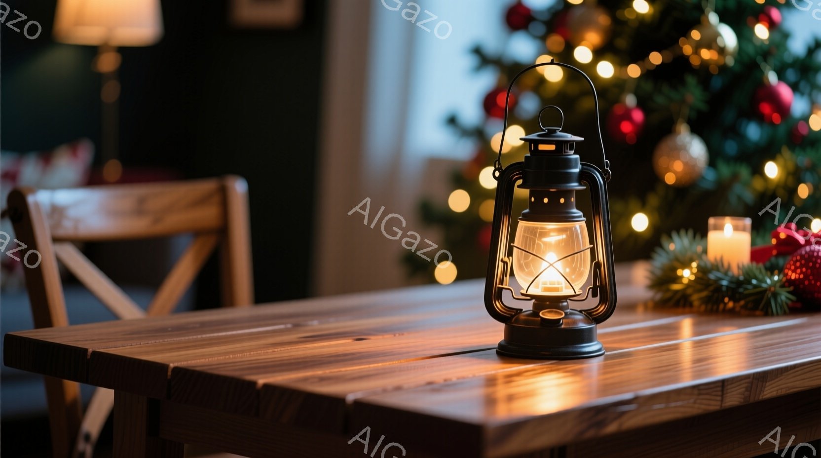 温かい光を放つ白いランタンが木製のテーブルの上に置かれています。背景にはクリスマスツリーがぼんやりと見え、オレンジと白の優しい光で飾られています。全体的に、温かく、落ち着いた雰囲気で、クリスマスの夜を思わせる静けさがあります。