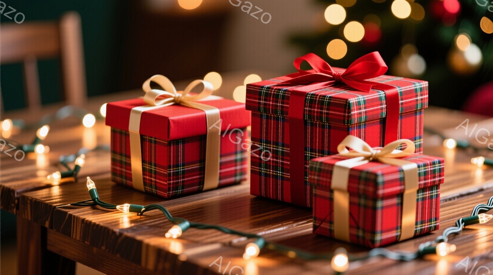 赤と緑のタータンチェック模様で包まれたギフトボックスが木製のテーブルの上に並べられています。ギフトボックスには赤いリボンが結ばれており、背景にはぼやけたクリスマスツリーの明かりが見えます。全体的に暖かく、お祝いの雰囲気が漂うクリスマスの光景です。