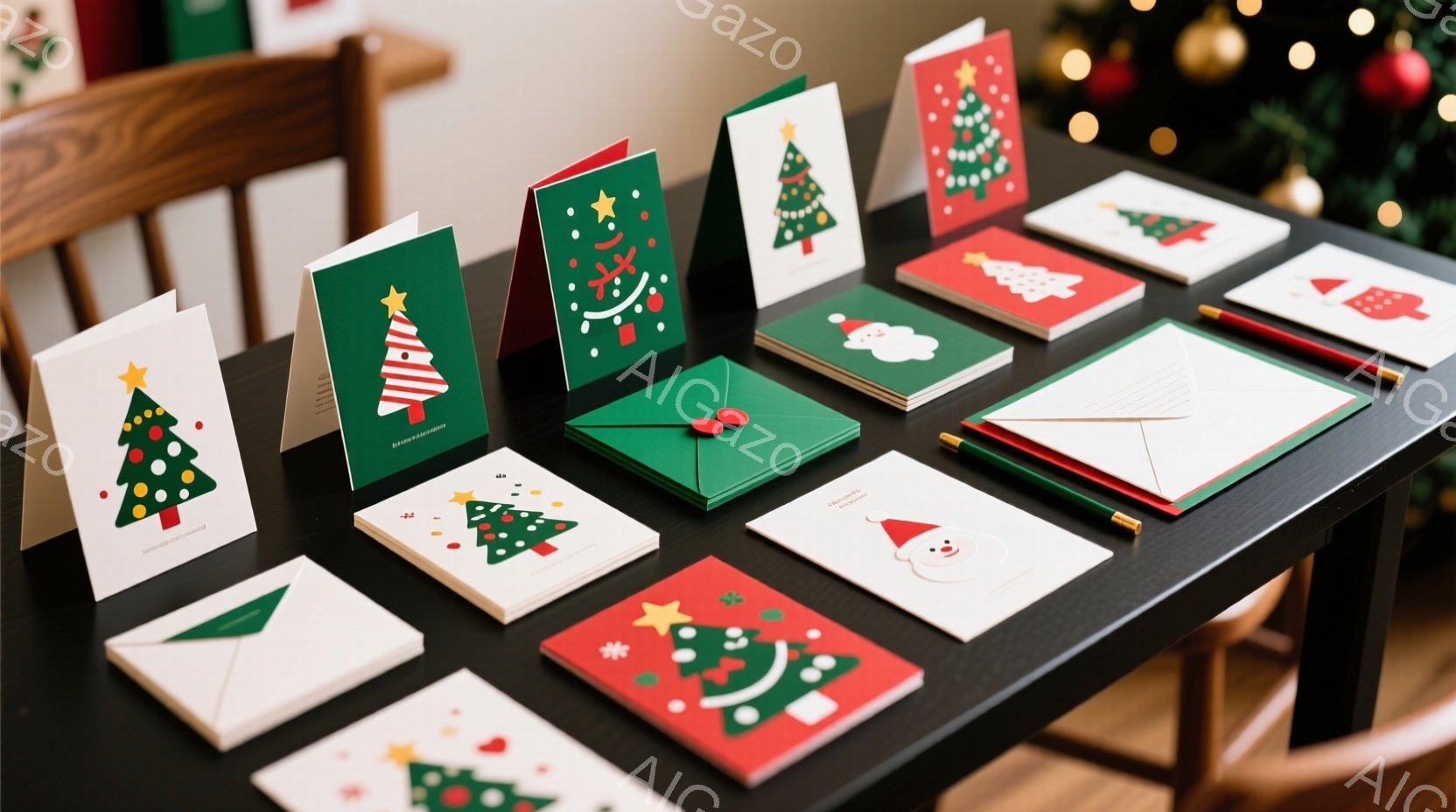 濃い緑色のテーブルの上に、クリスマスカード、封筒、ノート、鉛筆が並べられています。カードにはクリスマスツリーやサンタクロースが描かれており、封筒は鮮やかな緑色で、ノートは赤色の縁取りがあります。全体的に、クリスマスの準備や手紙を書くための心地よい雰囲気です。