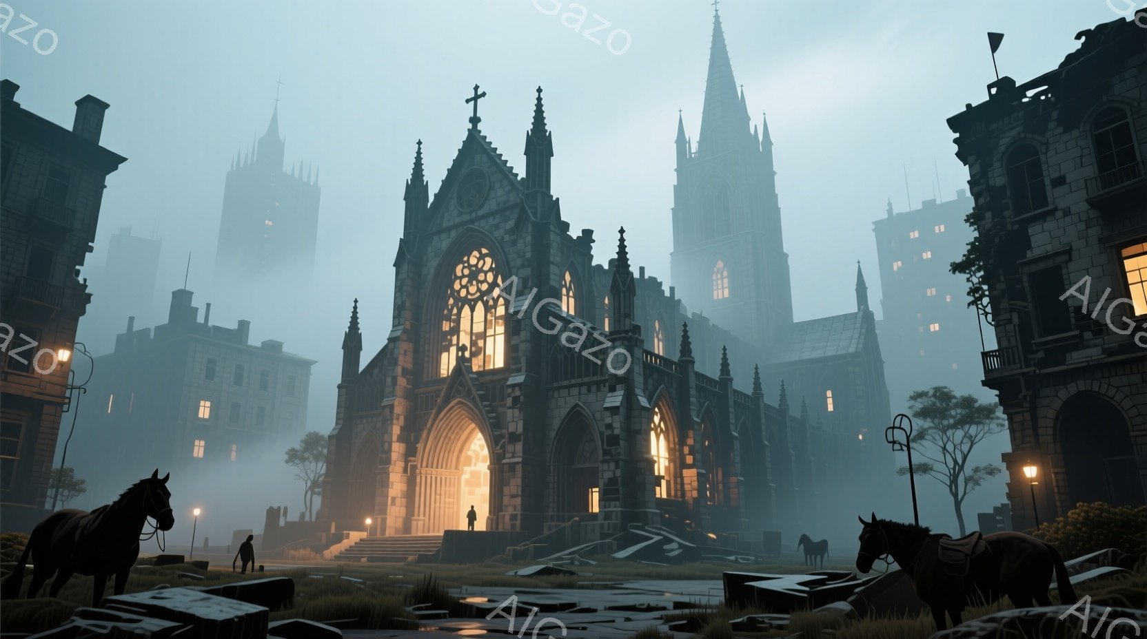 ゴシック様式の壮大な教会が、霧に包まれた荒廃した都市景観の中にそびえ立っている。教会は高い尖塔と大きなバラ窓を持ち、内部から暖かく黄金色の光が漏れ出している。周囲には瓦礫が散乱し、一部崩壊した建物が点在しており、荒涼とした雰囲気を醸し出している。