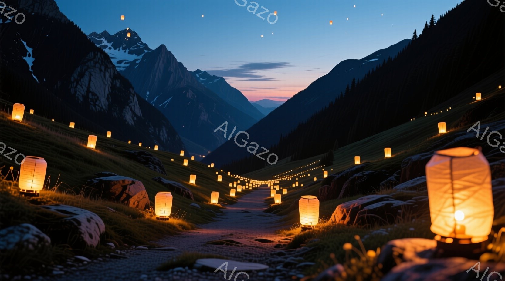 暗い山々の間を縫うように、石畳の道が伸びており、その両脇には無数の提灯が並んでいる。提灯の温かい光が、夜の暗闇に幻想的な雰囲気を添えている。遠くに見える山頂は雪を抱き、夕焼け空と相まって、静かで神秘的な情景が広がっている。