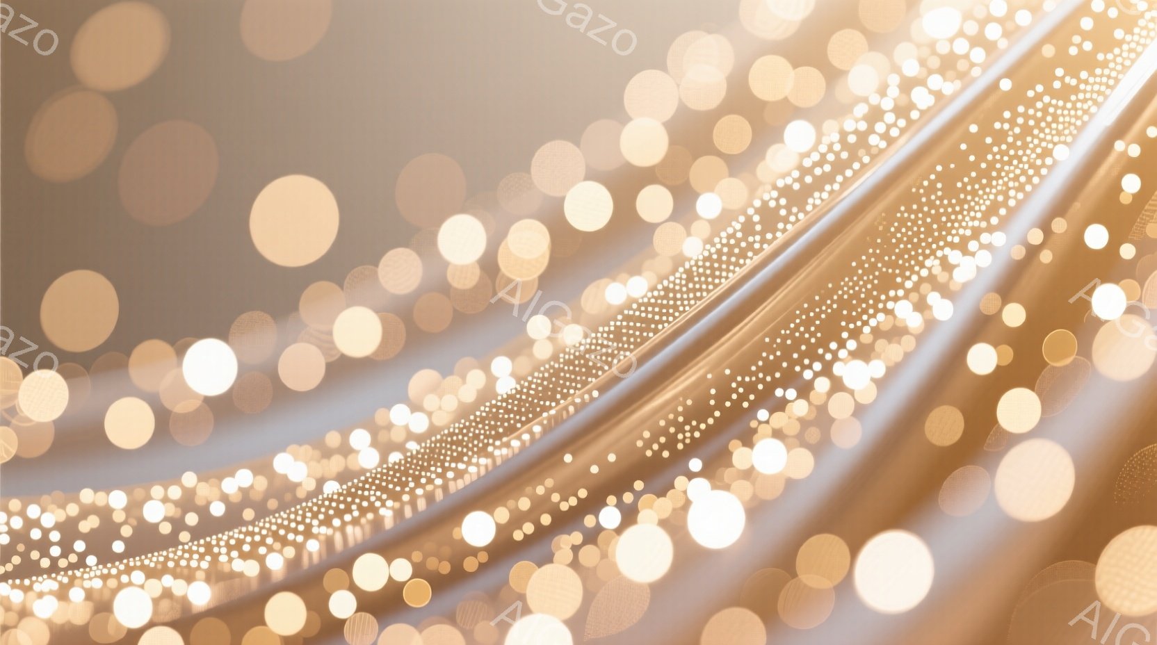 画像全体は、ぼんやりとした金色の光の粒子で満たされており、光の帯が画面を斜めに横切っています。粒子は大小さまざまな円形で、柔らかく暖かく、夢のような雰囲気を醸し出しています。背景は曖昧で、具体的な形は不明ですが、光の強さによって奥行きと動きが感じられます。