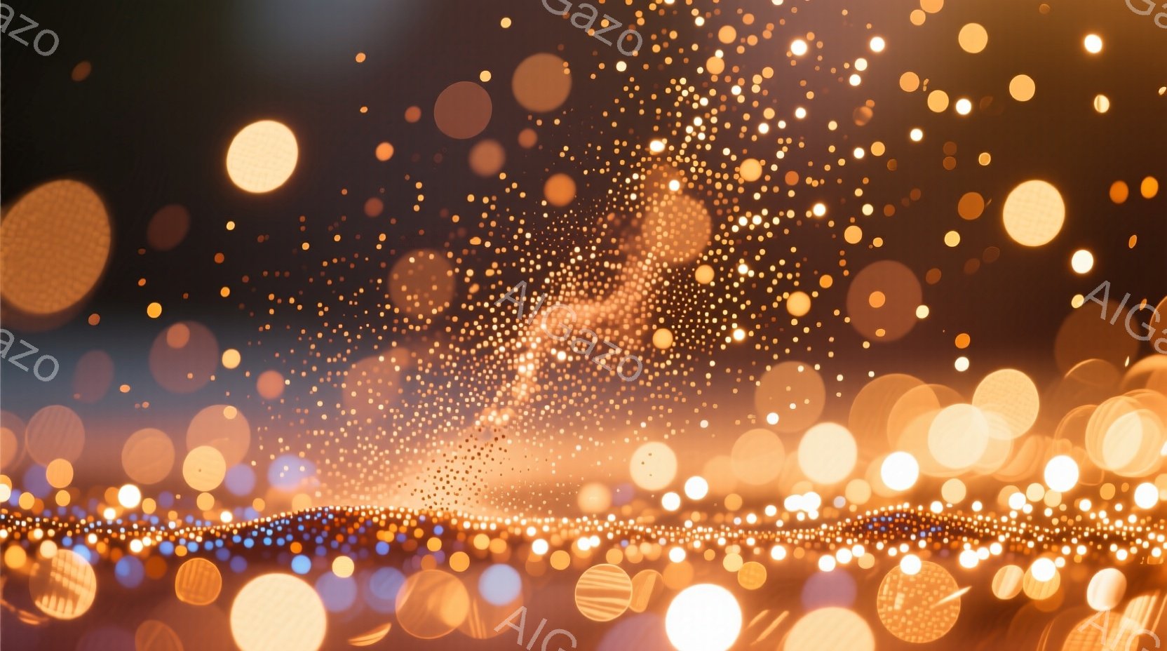 この画像は、ぼやけた光の粒子の抽象的な表現であり、暖色系のオレンジ、黄色、白が混ざり合っている。光の粒子は様々なサイズで、まるで夜空の星や、花火の散りばめられた様子を彷彿とさせる。全体的に幻想的で、きらめく雰囲気であり、どこか夢の中にいるような感覚を覚える。