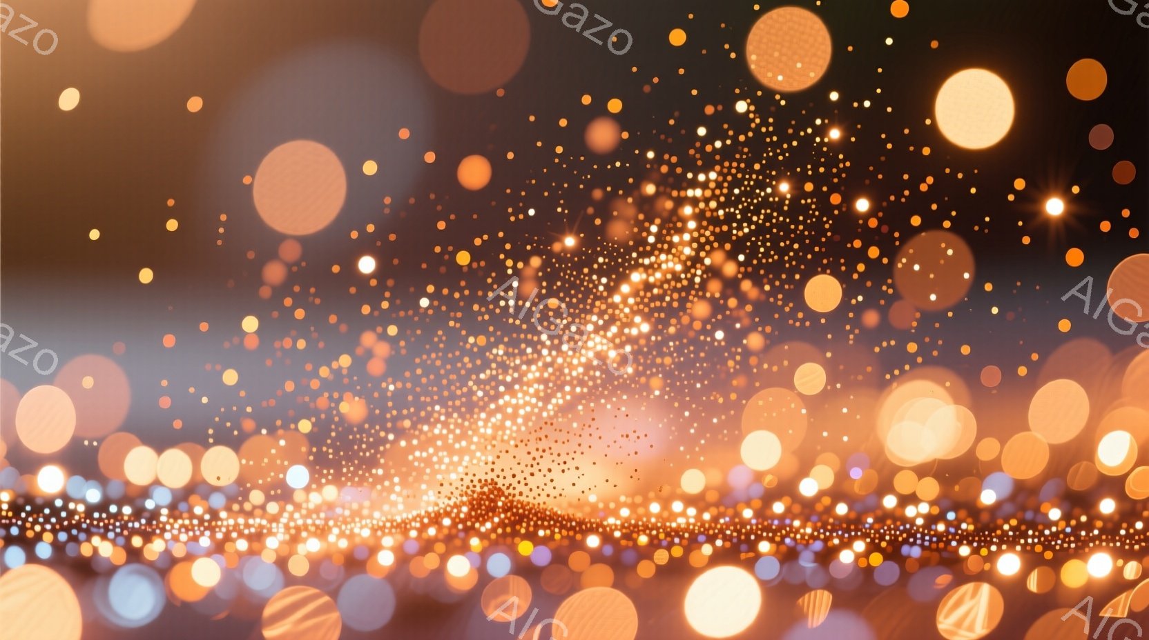 暖色系の光の粒子が広範囲に散りばめられた抽象的なイメージです。下部には、光の帯のようなものが地平線のように横たわっており、その上空にはより多くの光粒子が集中して漂っています。全体的に暖かく幻想的な雰囲気で、きらめく光の輝きが印象的です。
