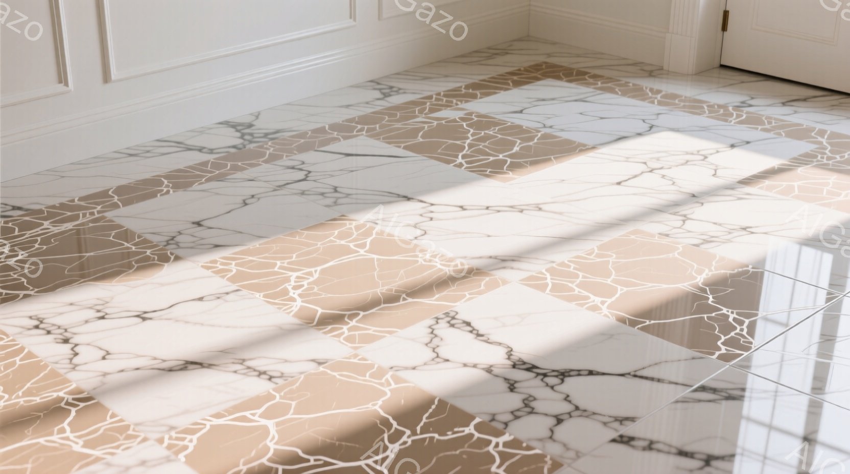 白大理石の床に金色のひび割れ模様が印象的なタイルが敷き詰められています。タイルは正方形で、床全体に規則的に配置され、光沢があり、豪華な雰囲気を醸し出しています。床の周りには、壁の一部が見え、室内である事が分かります。