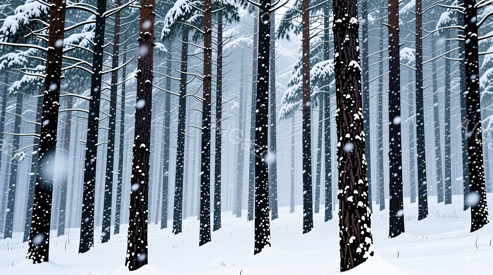 針葉樹の深い森が雪に覆われ、冬の静寂が漂っている。雪片が舞い、遠くの木々は霞んでおり、背景にはわずかに雪原が広がっている。全体的に冷たく、静謐で、冬の自然の美しさを捉えた様子である。