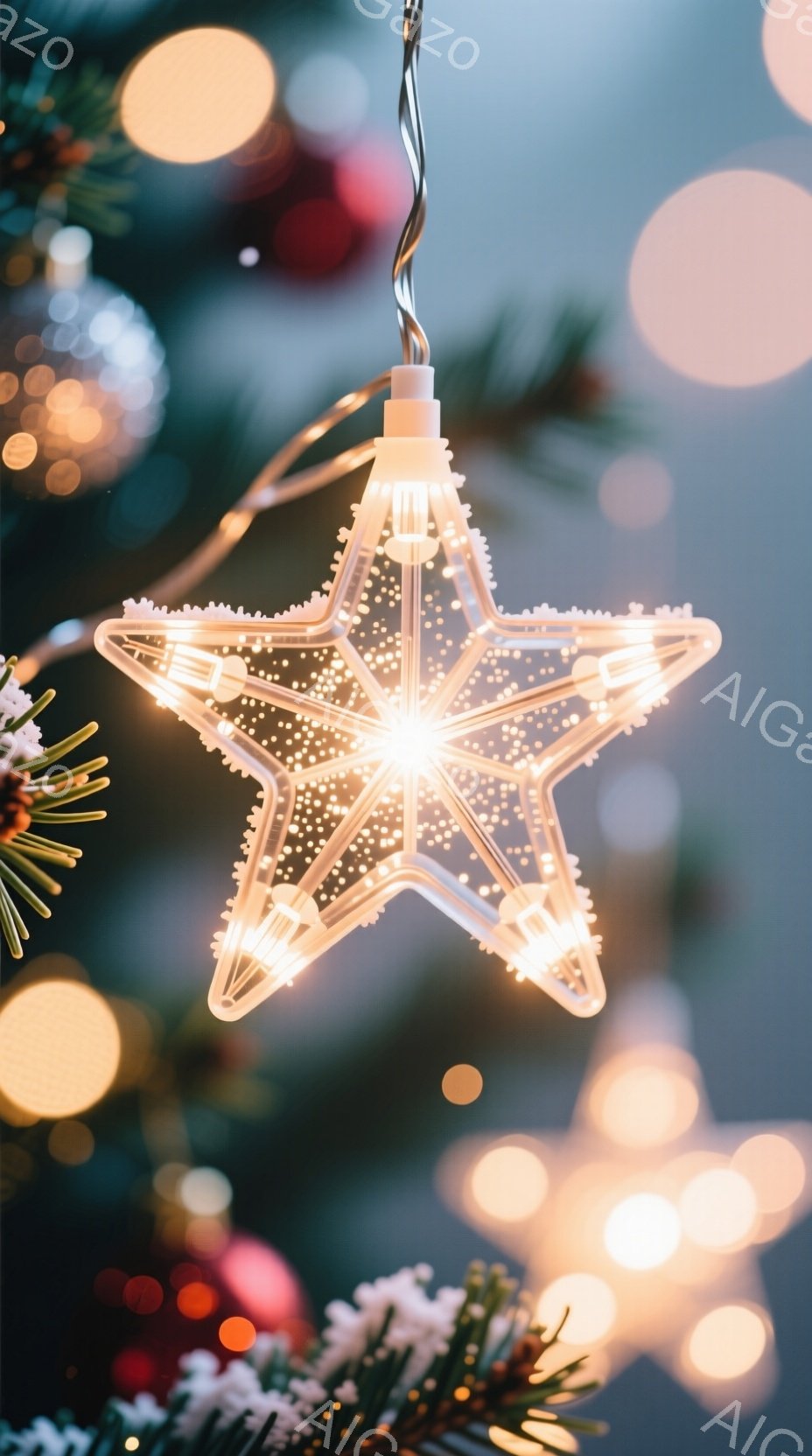 画像はクリスマスの装飾が施された背景の中で、光り輝く星形のイルミネーションが中心に描かれています。イルミネーションは半透明の素材でできており、内部に小さな光が散りばめられて、幻想的な雰囲気を醸し出しています。背景には、緑の葉や赤いオーナメントが見え、ぼんやりとした光のぼかしが、温かくお祝いのムードを演出しています。