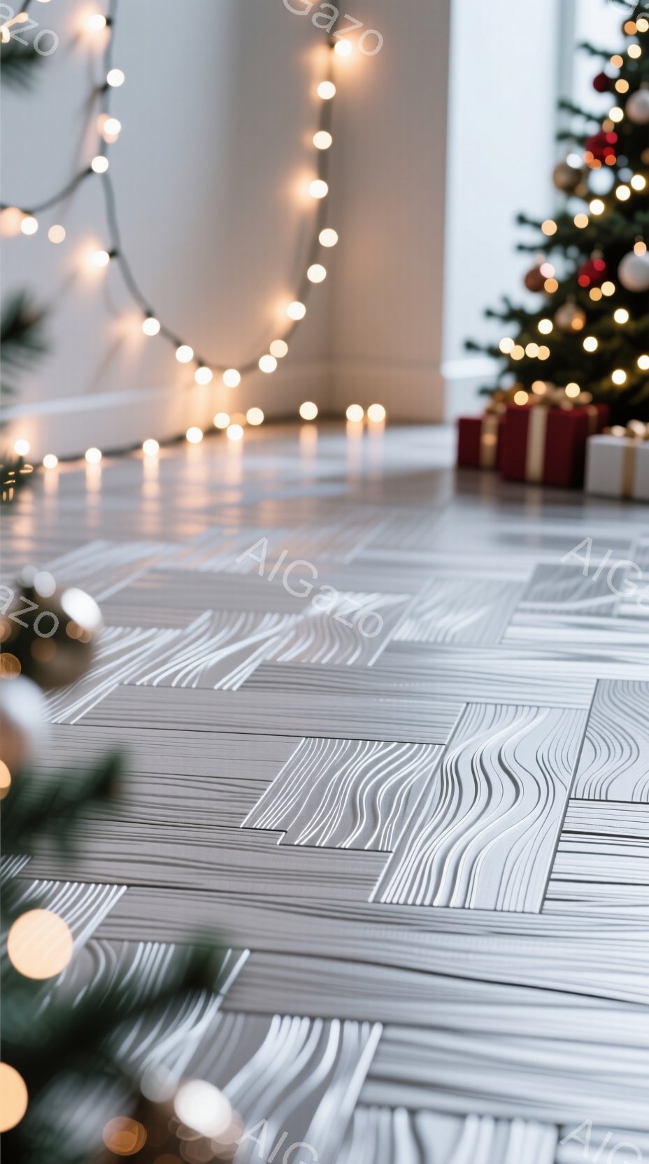 白を基調としたモダンな空間で、木目調の床にイルミネーションライトが散りばめられています。背景にはクリスマスツリーがぼんやりと見え、プレゼントボックスがいくつか置かれています。全体的に暖かく、お祝いムードに包まれた、静かで落ち着いた雰囲気です。
