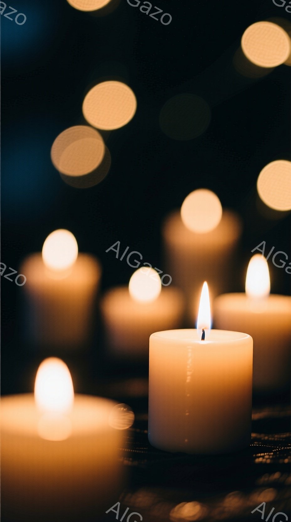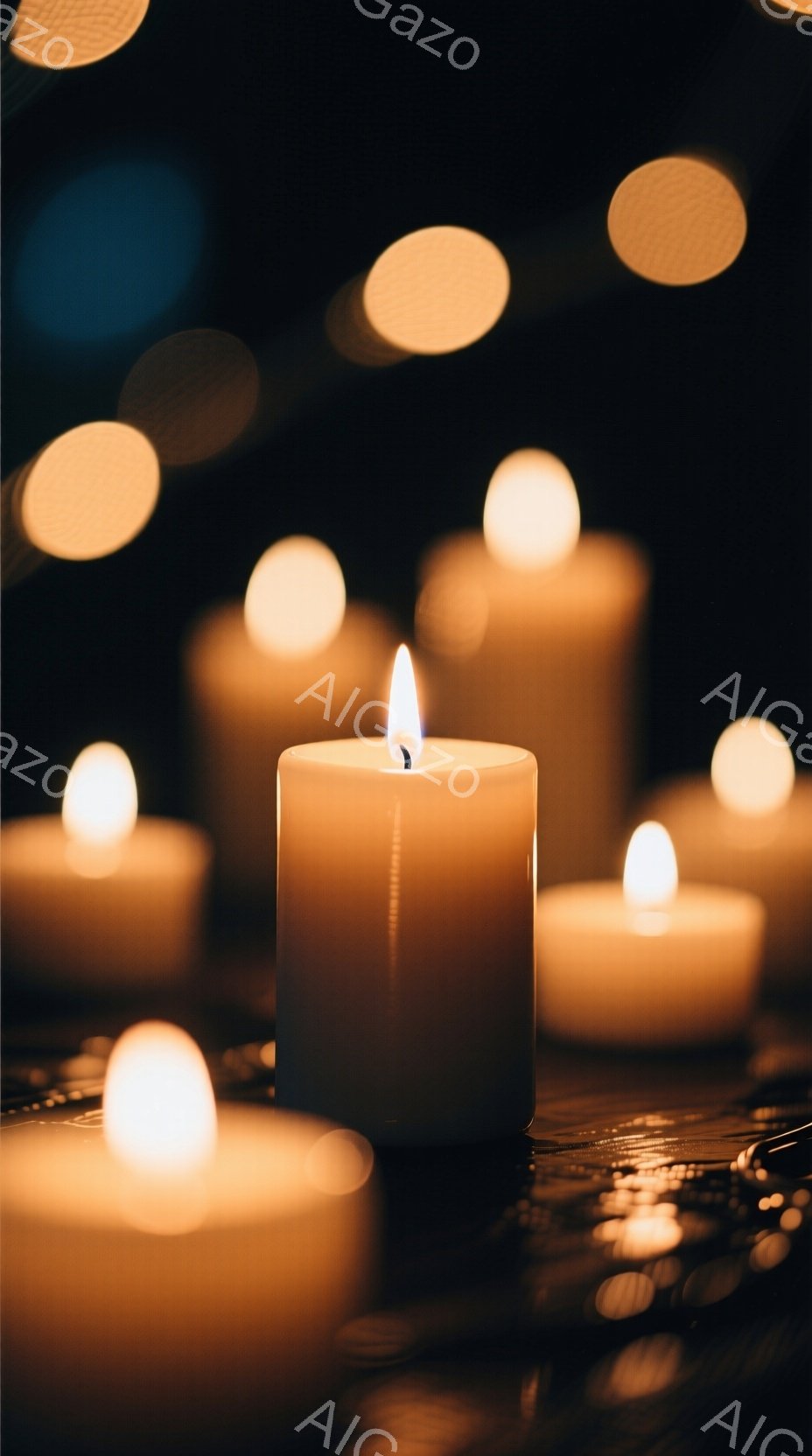 暗い背景に複数の白いキャンドルがぼんやりと光っています。キャンドルの炎はそれぞれ微妙に異なり、暖かく穏やかな光を放ち、周囲にぼかしが入っています。全体的に、静寂で瞑想的な雰囲気が漂っており、柔らかな光が穏やかな感覚を与えます。