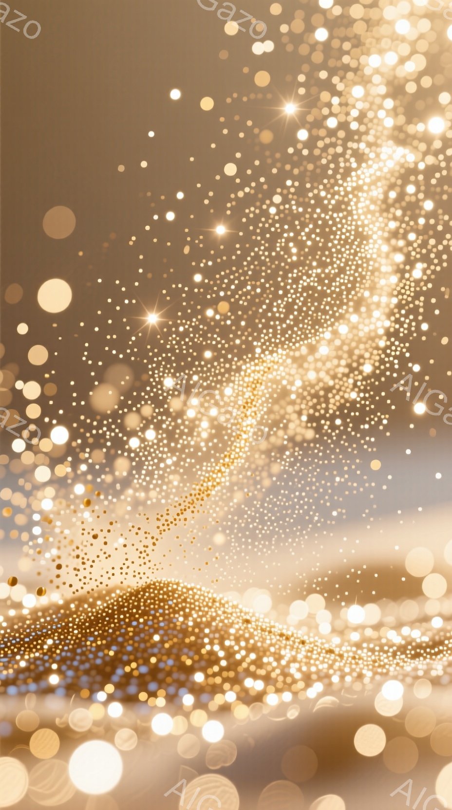 この画像は、金色のきらめきと光の粒子で構成された抽象的な背景画像です。光の筋が放射状に広がり、暖かく幻想的な雰囲気を醸し出しています。ぼやけた光の玉が重なり合い、夢のような空間を表現しています。