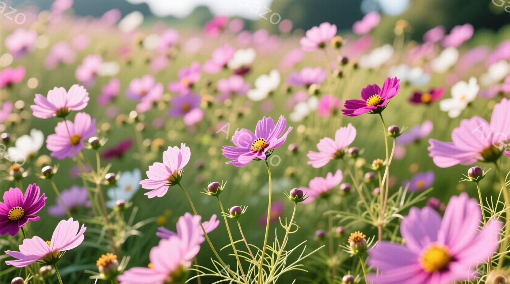 広大な花畑が広がっており、ピンクや白、黄色のコスモスが咲き乱れている。背景には緑の草地と遠くの山々が見え、晴れた空には白い雲が浮かんでいる。全体的に明るく、穏やかで、自然の美しさを感じさせる雰囲気である。