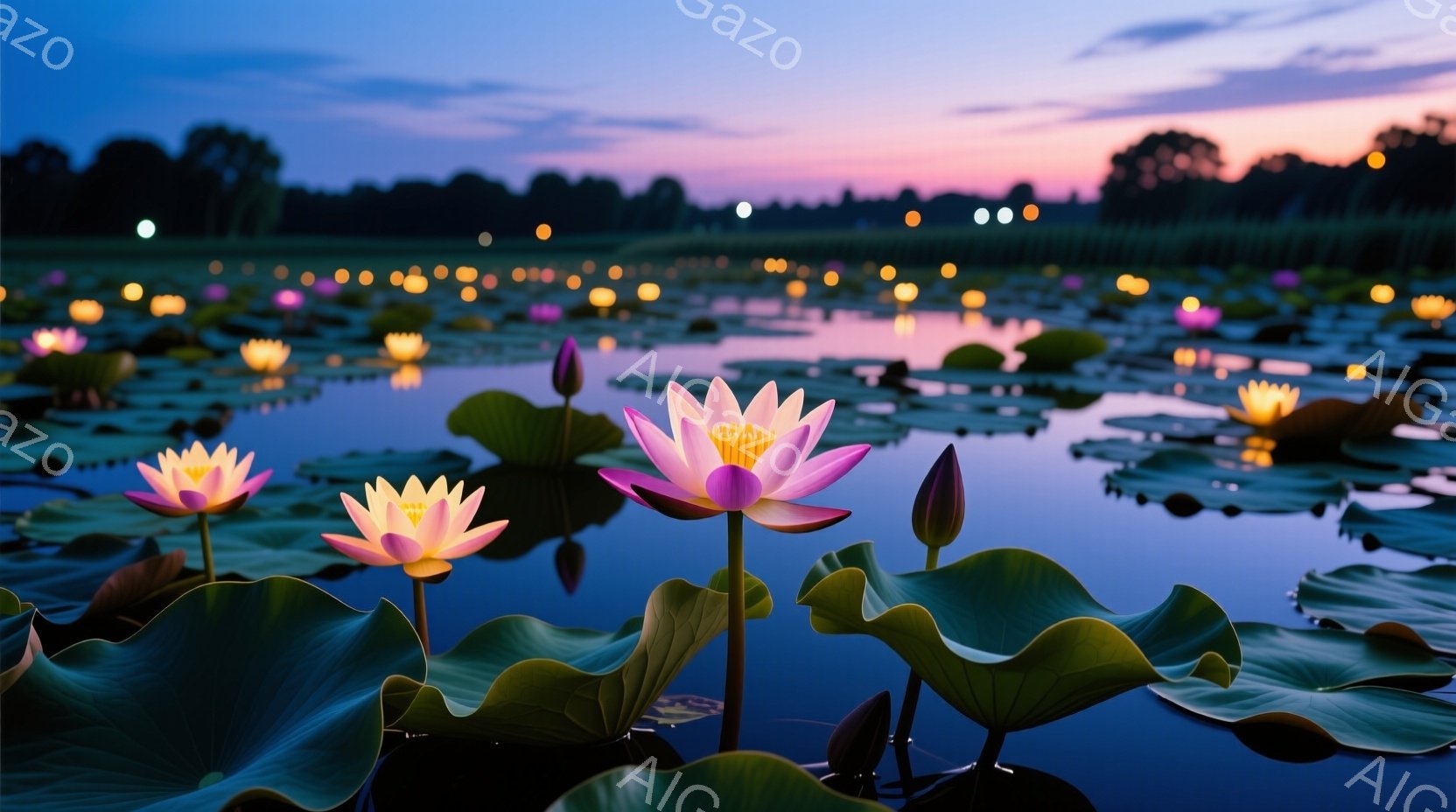 鮮やかなピンク色の蓮の花が水面に咲き誇り、緑の大きな葉の上に咲き乱れている。背景には、夕焼け空の下、遠くの岸辺にぼんやりと光る無数の灯りが並び、穏やかな水面に反射して幻想的な雰囲気を醸し出している。夕暮れ時の静寂と蓮の美しさが調和し、平和で瞑想的な情景が広がっている。