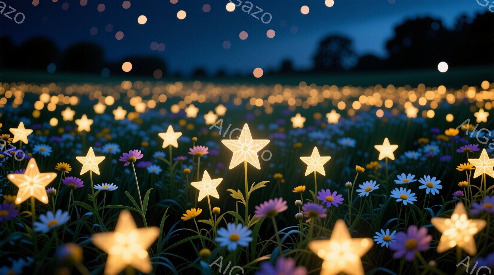 夜の野原に無数の光る花が咲き乱れ、幻想的な光景が広がっています。紫、ピンク、白などの色とりどりの花に、星のような光を放つ花が点在し、まるで夜空が地上に降りてきたようです。遠くには暗い樹木が見え、夜空にはぼんやりとした月と星が輝いています。