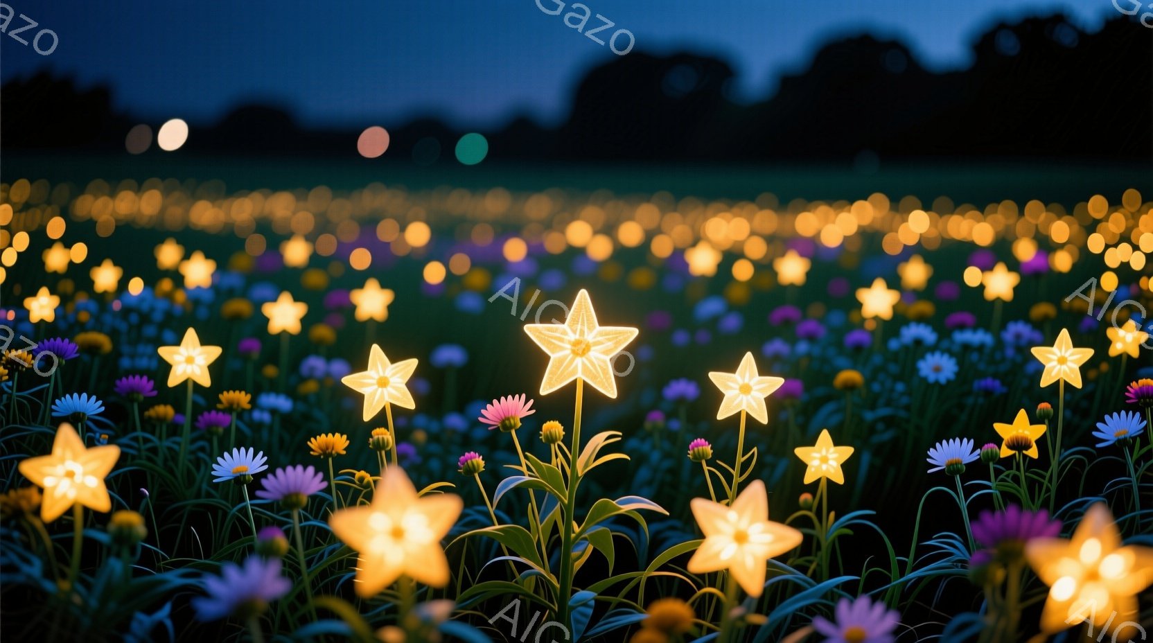 夜の草原が描かれており、無数の光る星の花が咲き乱れている様子が印象的だ。紫色の小さな花々と緑の葉が星の花の周りを彩り、背景にはぼんやりと木々のシルエットが見える。 全体的に幻想的で、穏やかで温かい雰囲気が漂っている。