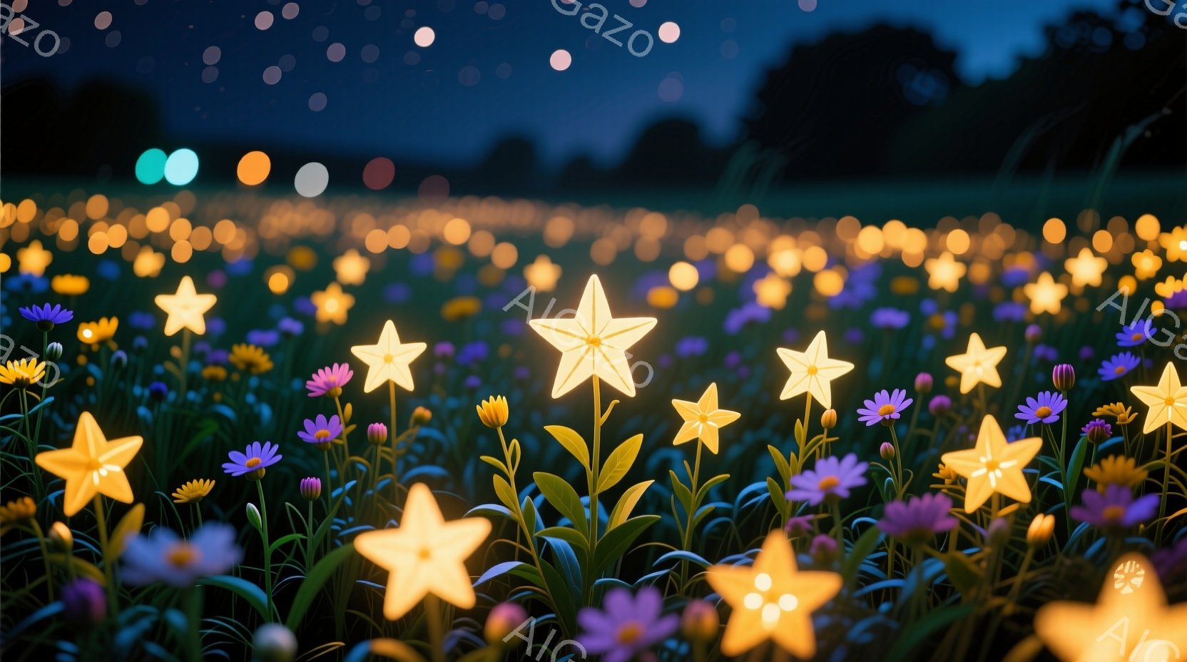 夜の暗い草原に、無数の光る星のような花が咲き乱れている様子が描かれています。紫、白、黄色の花々が密集し、その上に明るい光を放つ星の花が咲き誇り、幻想的な雰囲気を醸し出しています。遠くにはぼんやりと木々のシルエットが見え、夜空にはいくつかの明るい光が点在しています。