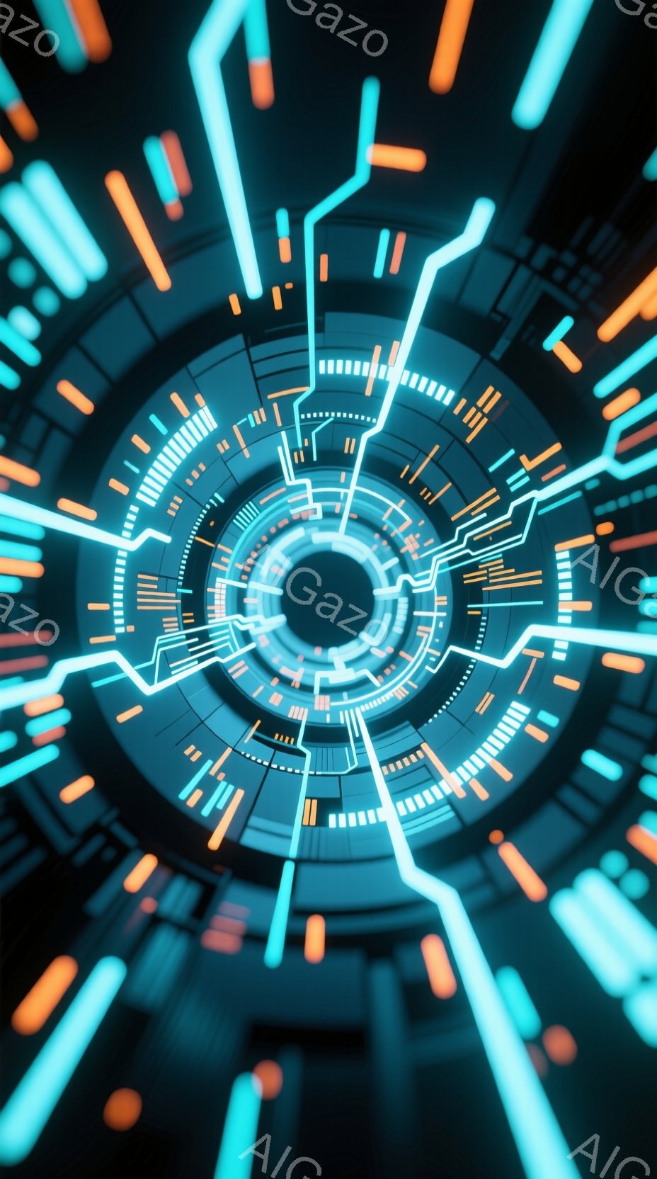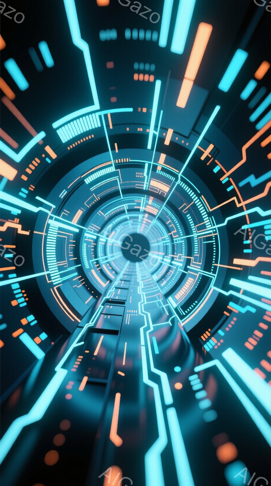 この画像は、中心に向かって収束するサイバーパンク風のトンネルを描いています。青とオレンジのネオンライトが複雑な回路模様を描き、未来的な空間を作り出しています。円形のデザインと光の軌跡が、無限に続くような感覚を呼び起こします。