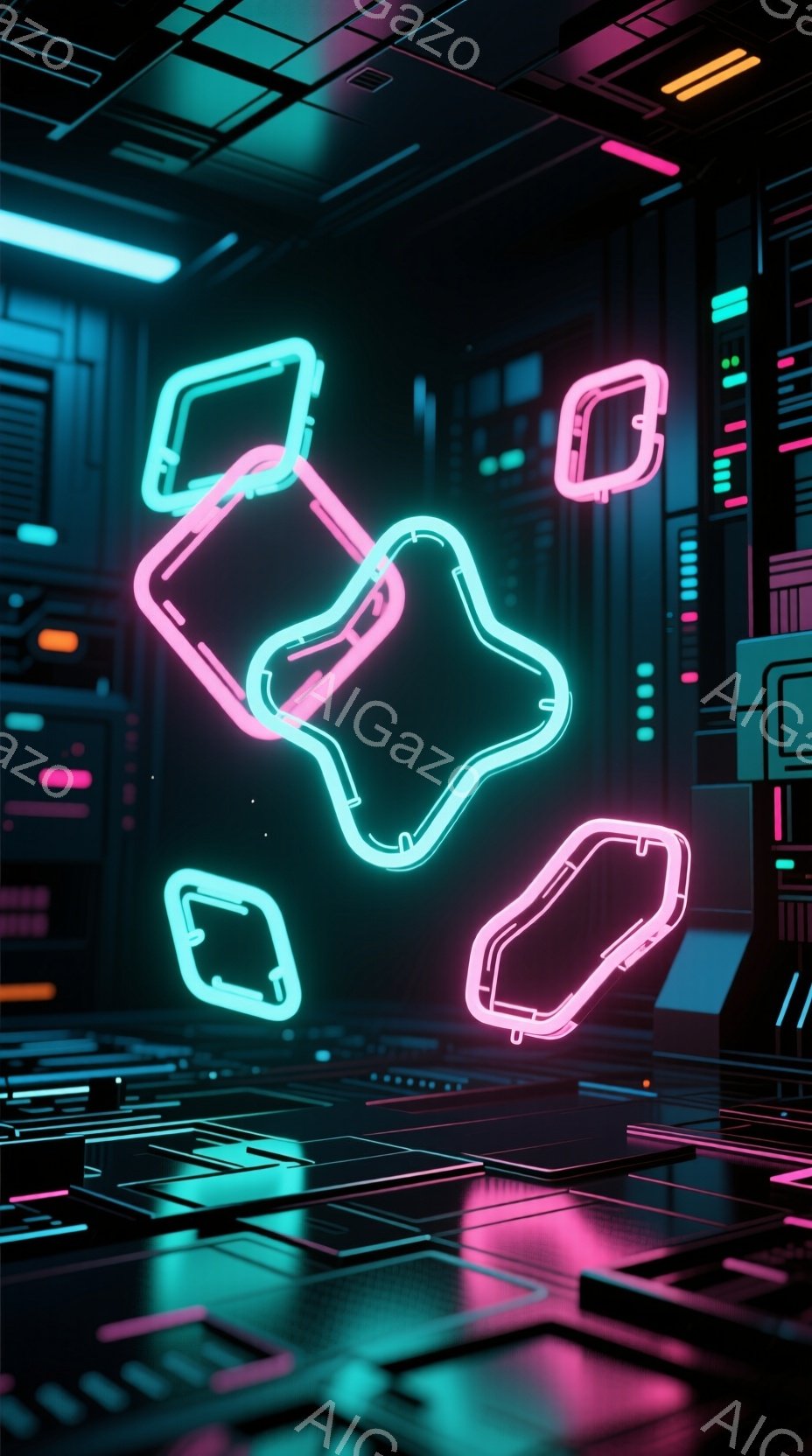 鮮やかなネオンカラーで照らされたサイバーパンク風の空間が描かれています。幾何学的な形状の発光体(立方体、円、四角形)が、暗い背景に浮かび上がり、未来的な雰囲気を醸し出しています。全体的に、テクノロジーとアートが融合した、洗練された印象を与える画像です。