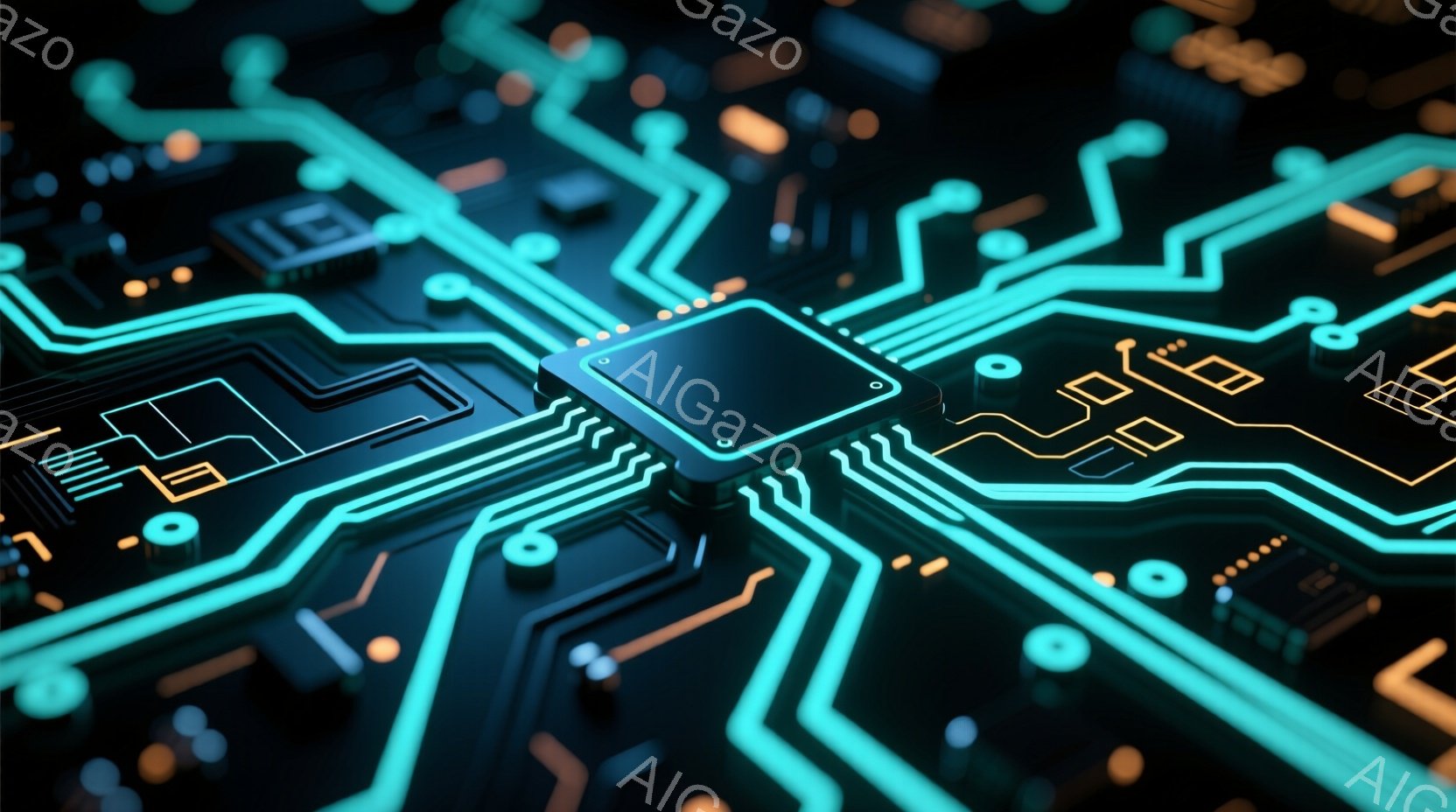 鮮やかなネオンブルーとオレンジ色の電子回路が、黒い背景に複雑に広がり、中心には四角いチップが配置されている。回路は未来的な印象を与え、光沢のある質感で表現されている。全体的にテクノロジーとデジタル世界の洗練された雰囲気を感じさせる画像である。
