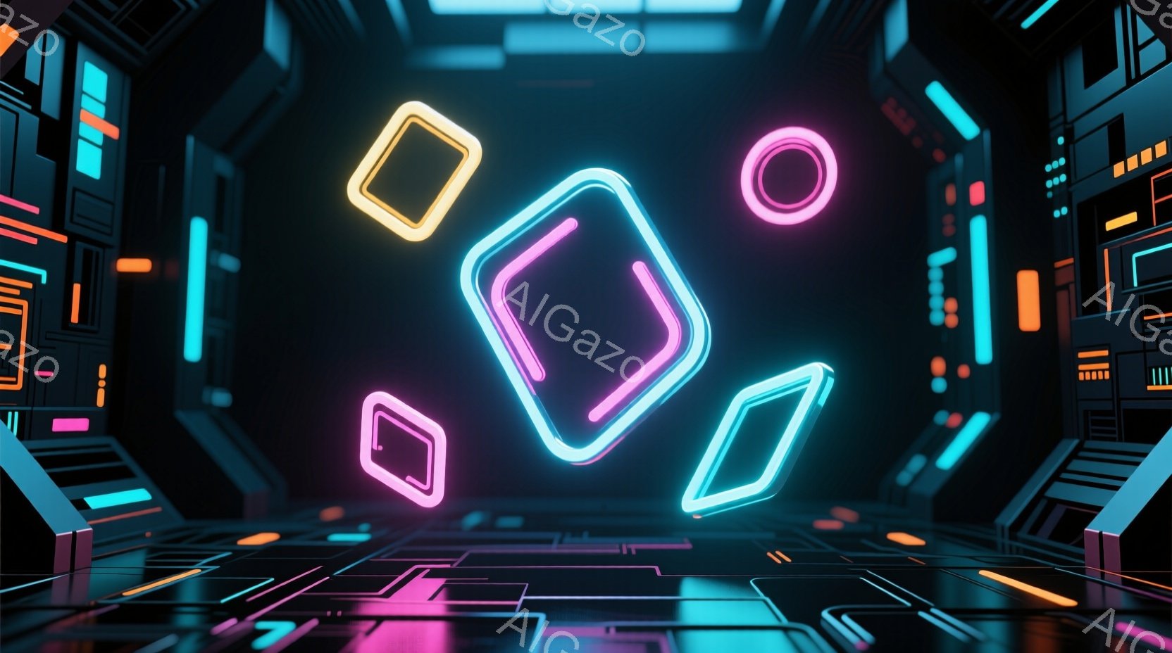 鮮やかなネオンカラーの幾何学的な図形が暗闇の中に浮かび上がっている様子が描かれている。中央には大きな正方形が配置され、その周りを様々な大きさの円や小さな正方形が囲んでいる。背景は未来的な回路や構造物で構成され、サイバーパンクやデジタルアートの世界観を想起させる鮮烈な光のコントラストが印象的だ。