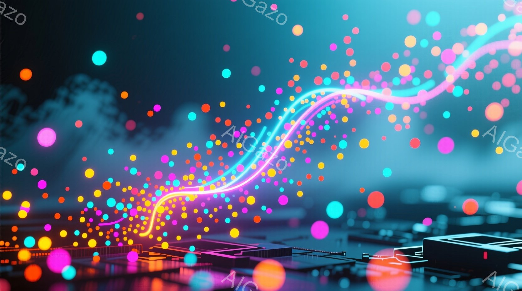 鮮やかなネオンカラーの球体が無数に漂う、未来的で抽象的な光景が描かれています。ピンク色の光の線が画面を斜めに横切り、球体と混ざり合いながら幻想的な輝きを放っています。背景には、ぼんやりとした幾何学的な構造物が見え隠れし、全体的にサイバーパンク風の、どこか神秘的な雰囲気を醸し出しています。