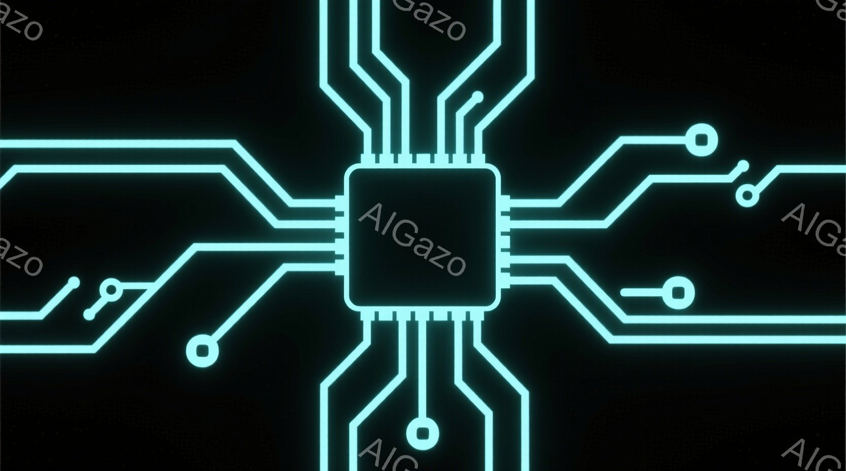 暗い背景に、明るいターコイズブルーの線で描かれた電子回路が浮かび上がっています。中央には、ピンが多数並んだ四角いICチップが配置され、そこから放射状に細い線が伸びています。全体的に未来的な印象で、テクノロジーやデジタル世界を象徴しているように見えます。