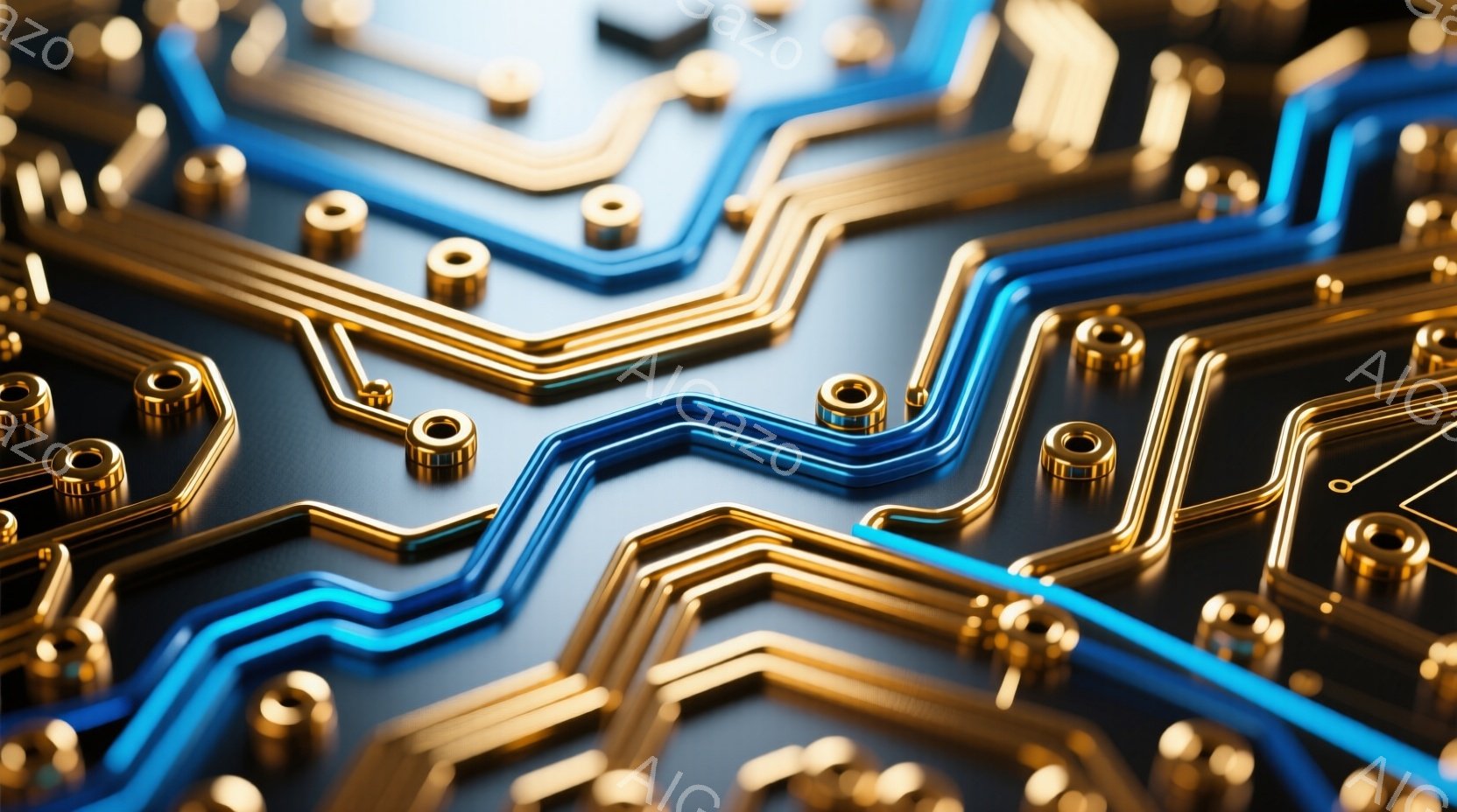 この画像は、黒い背景に金色の配線と青い光る線が複雑に組み合わさったプリント基板の一部を捉えています。中央には金色のマイクロチップが配置され、高度な技術と精密さを強調しています。全体的に、未来的で洗練された印象を与え、テクノロジーの進化を象徴しているようです。