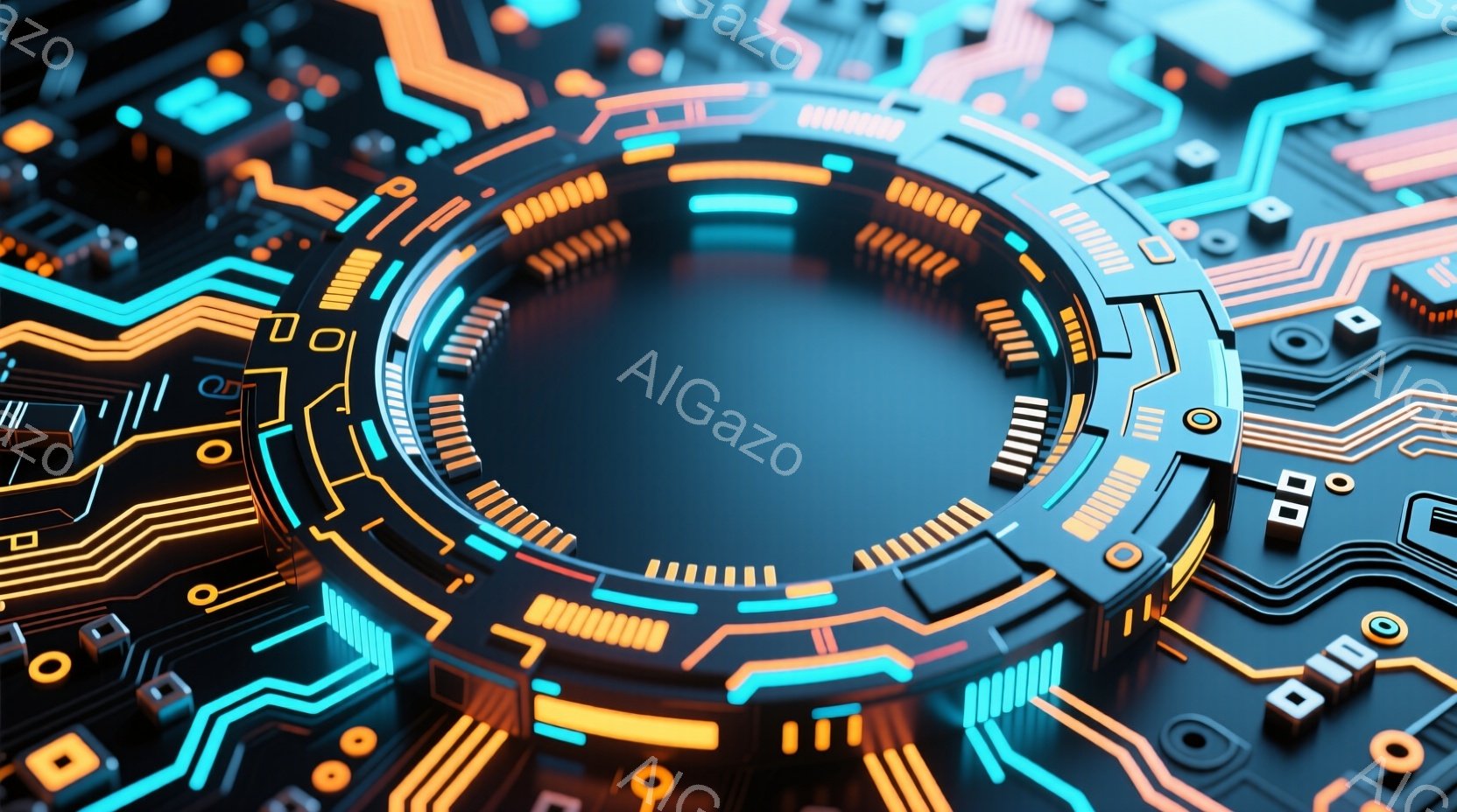 鮮やかなネオンカラーの回路基板が複雑に絡み合い、中央に円形の空洞を形成しています。青とオレンジのラインが光り輝き、未来的なテクノロジーのイメージを喚起させます。全体的に、精密さとエネルギーが溢れる抽象的なデザインです。