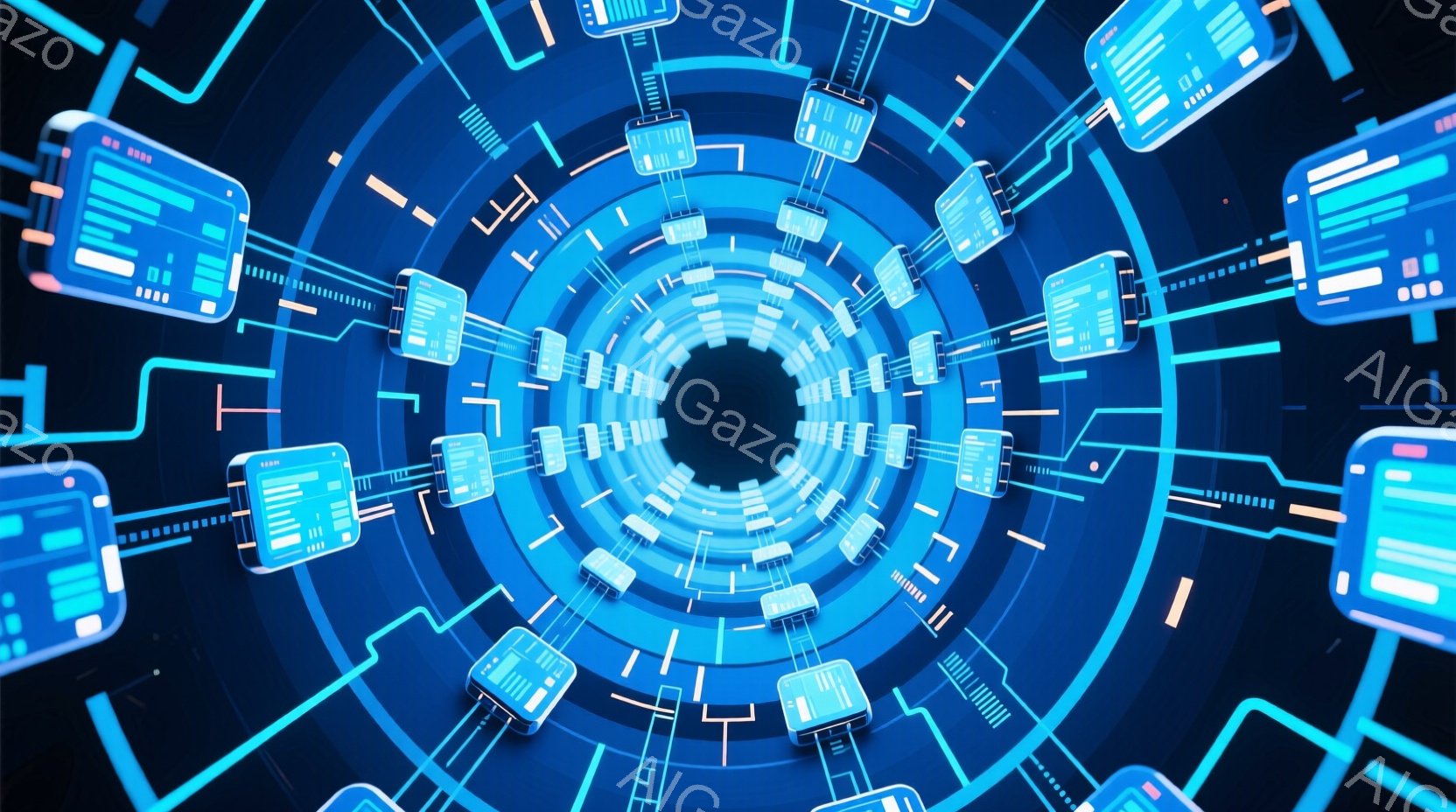この画像は、中心に向かって収束するサイバーパンク風のトンネルを描いています。青とオレンジの光る線と矩形が螺旋状に配置され、未来的なデジタル空間を表現しています。暗い中心部と、光の線が作り出す強いコントラストが、没入感と奥行きを強調しています。