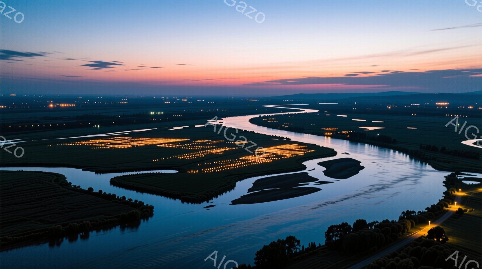 蛇行する川が、緑豊かな低地を縫うように流れており、夕暮れ時の空が鮮やかなオレンジ色と紫色に染まっている。川面には無数の光が散らばり、まるで星空が水面に映り込んでいるかのような幻想的な光景を作り出している。遠くにはぼんやりと山並みが視認でき、静かで穏やかな雰囲気が漂っている。