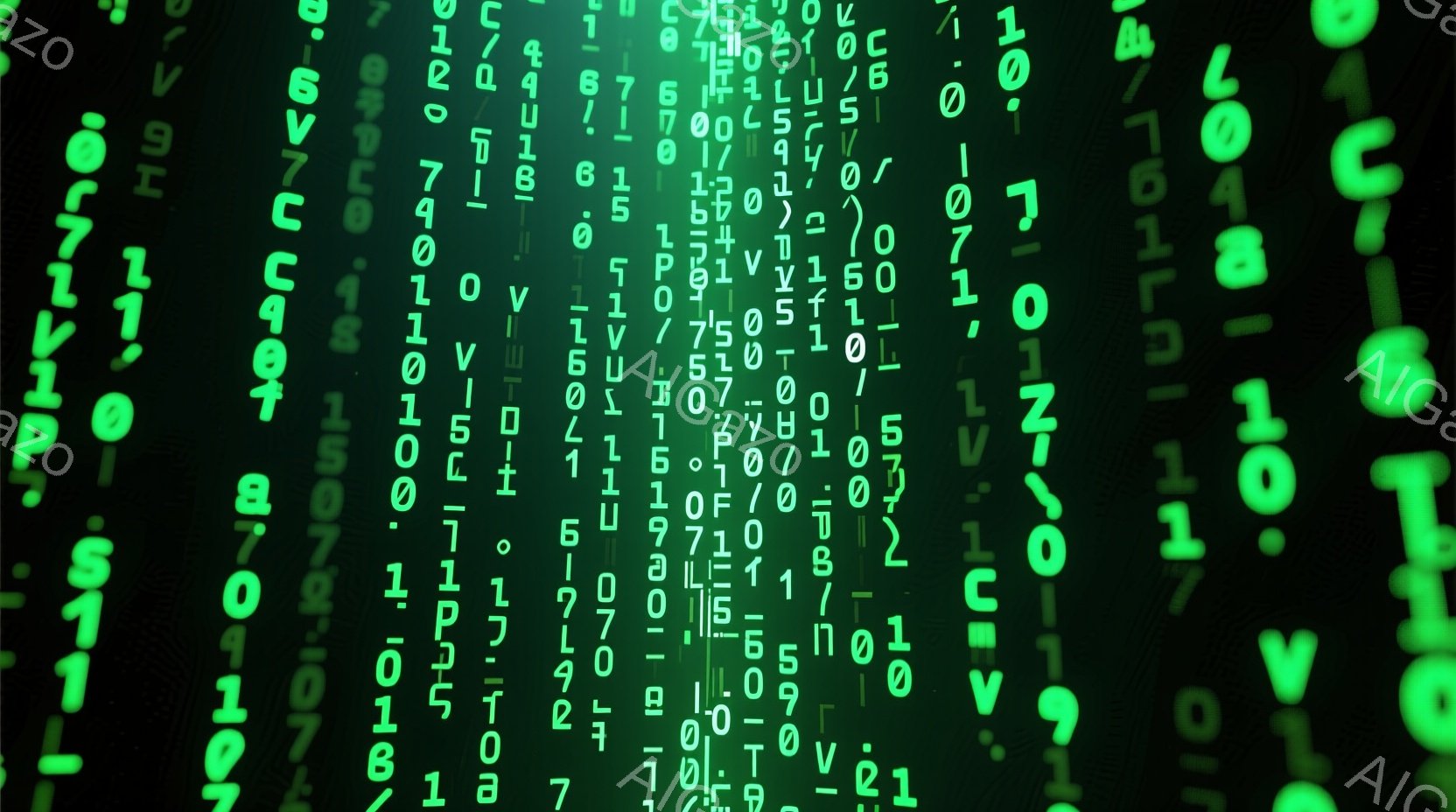 画面全体が緑色の数字と記号で埋め尽くされており、マトリックスのようなデジタルな雰囲気を醸し出しています。光沢のあるデジタル文字が乱雑に配置され、サイバーパンクやハッキングを連想させる視覚効果を生み出しています。鮮やかな緑色の背景が、未来的なテクノロジーと仮想現実の世界を想起させます。