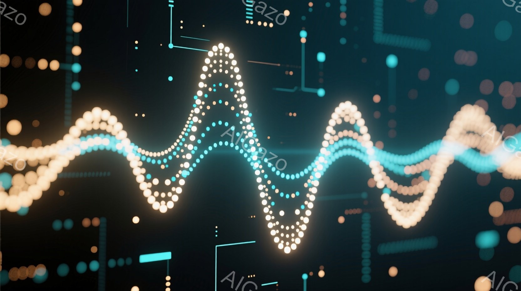 鮮やかなターコイズブルーとオレンジ色の粒子が、暗い背景に浮かび上がっています。これらの粒子は波形を描き、まるで音や信号の視覚化のようです。背景には、細い線や小さな光点が散りばめられており、デジタルで未来的な雰囲気を醸し出しています。