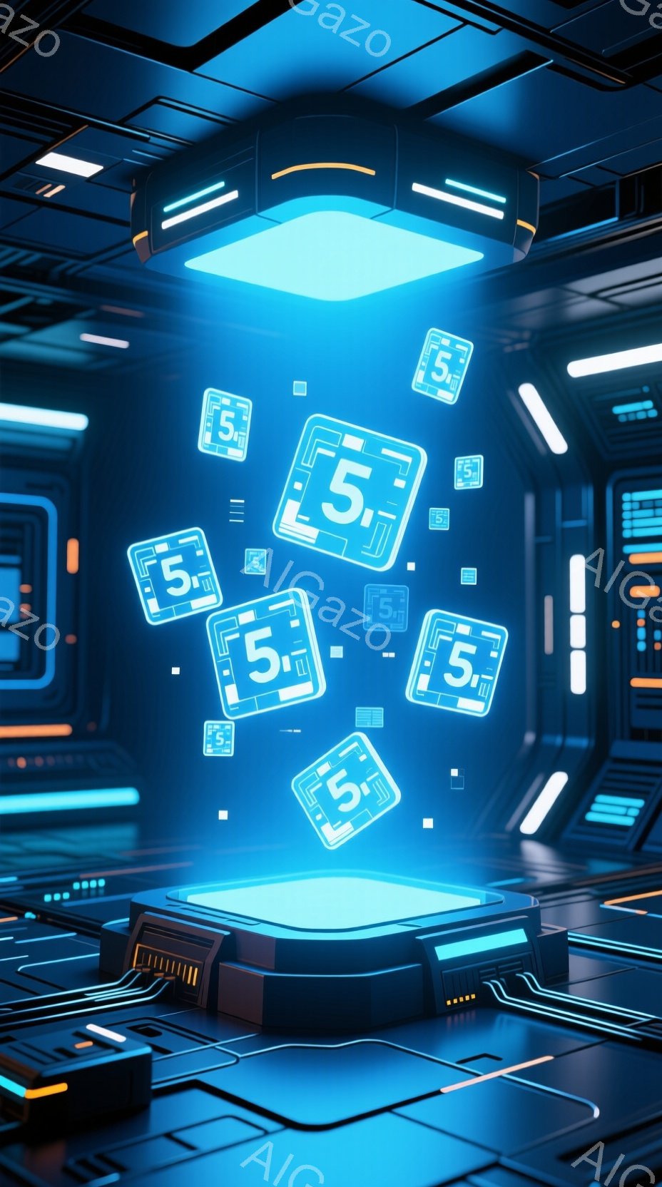 鮮やかな青色の未来的な光景が描かれています。中央には、複雑な回路が刻まれた立方体が浮かび、下には光るプラットフォームが配置されています。背景には、未来都市を思わせる幾何学的なパターンが広がり、全体的にクールでテクノロジーを感じさせる雰囲気です。