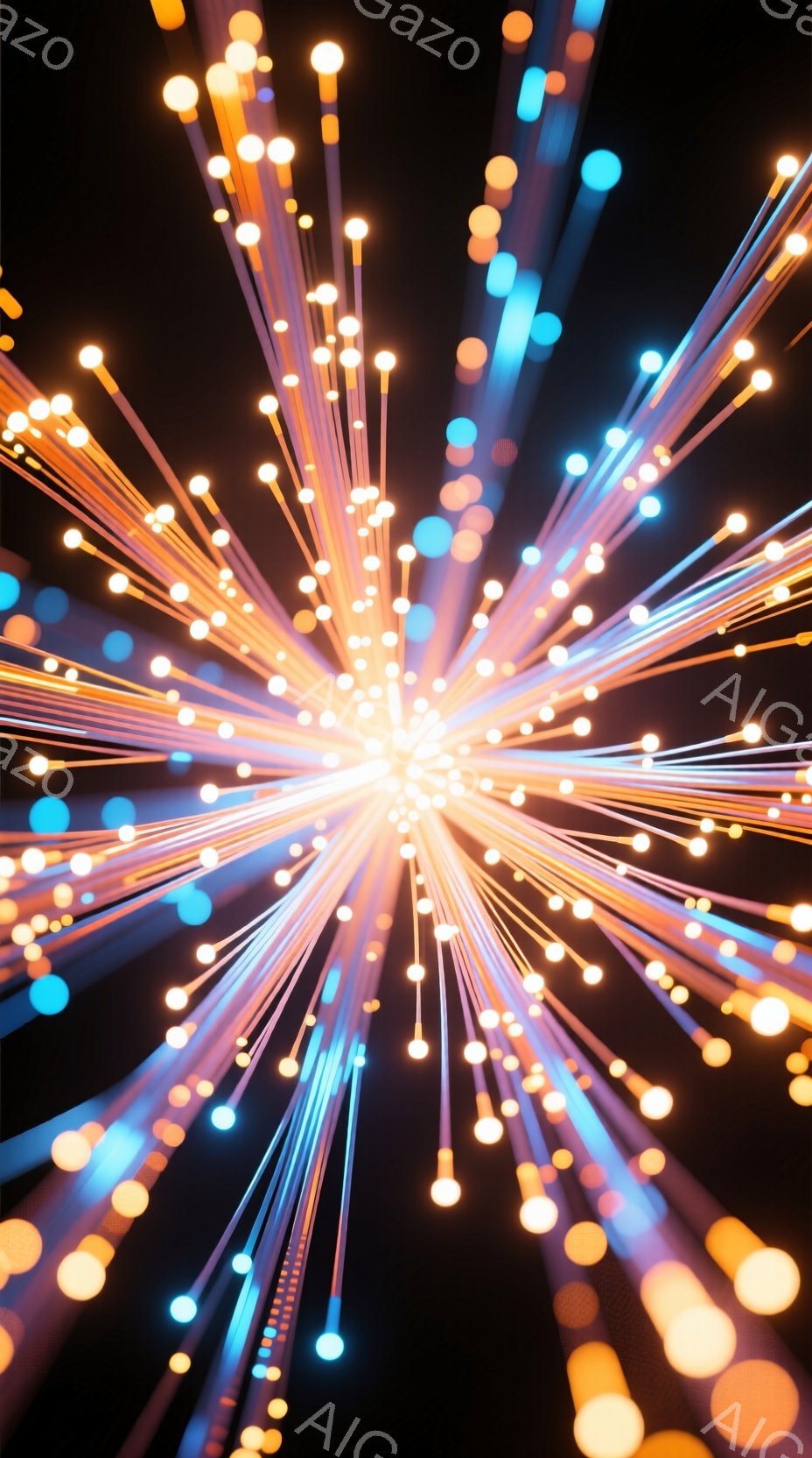 この画像は、暗い背景から放射状に広がる光の筋で構成されています。光は白、オレンジ、青の色調を持ち、まるで何かが爆発したり、エネルギーが放出されたりした様子を表現しています。全体的に、ダイナミックで未来的な印象を与える抽象的な表現です。