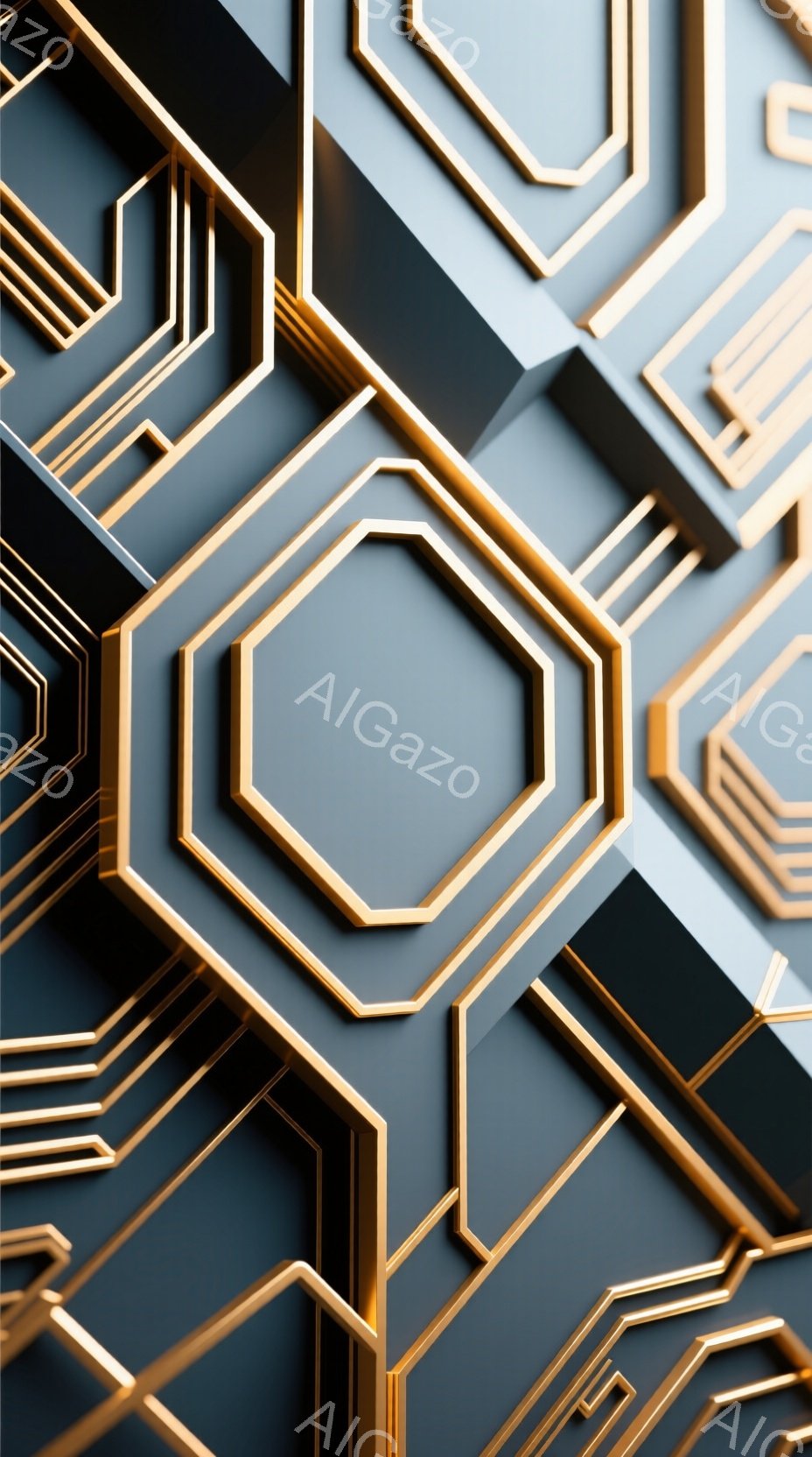 この画像は、幾何学的な模様が複雑に絡み合った抽象的な構成です。白、黒、金色の組み合わせが特徴的で、立体的な陰影によって奥行きが強調されています。模様は多角形や直線で構成され、洗練されたモダンな雰囲気を醸し出しています。